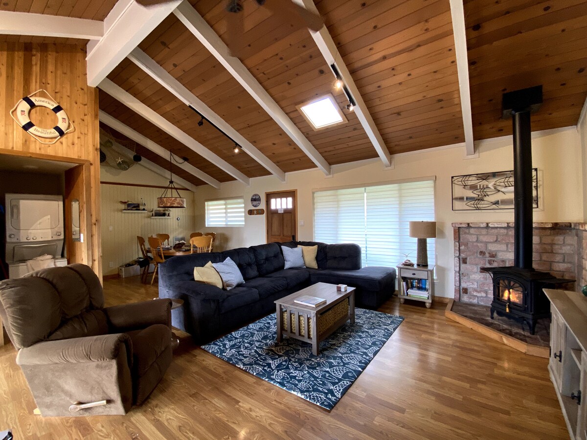 Relaxe e recarregue as energias neste espaço calmo e elegante. Acorde com vista para janelas panorâmicas enormes para as árvores, prados e o oceano ao longe. Doce deck nos fundos com vista para um pequeno prado e para a floresta. Lareira aconchegante para conversas nas profundezas da noite. Espaço para abrir os tapetes de ioga ou ser criativo. Um bar e bancos de bar personalizados para comer e beber. Balcões artesanais, cozinha pequena e banheiro elegante com azulejos de ardósia, pia especial e novos azulejos de parede. Caminhada de vida selvagem na pista rural .