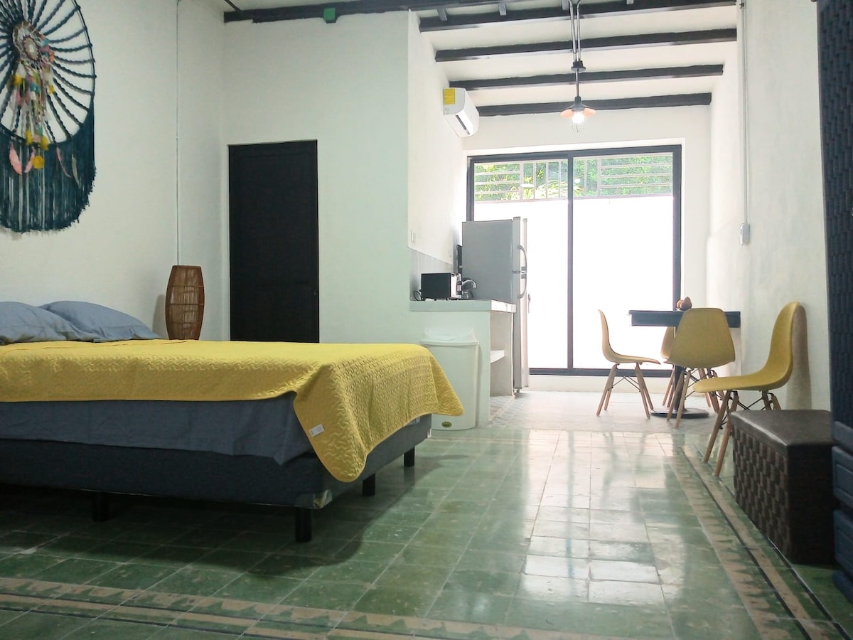 Apartamento espaçoso dentro de casa colonial, perfeito para 2. Localizado a leste do centro de Mérida, perto do bairro ChemBech, a apenas 20 minutos a pé da praça principal. Recebe viajantes que buscam calma e introspecção. Único em estilo e design, com acabamentos de luxo, garante privacidade longe do centro da cidade. O apartamento é completamente privado, no andar inferior. Tem uma cozinha totalmente equipada e sala de estar, uma piscina, um jardim, um terraço, um quarto king com uma casa de banho em mármore.