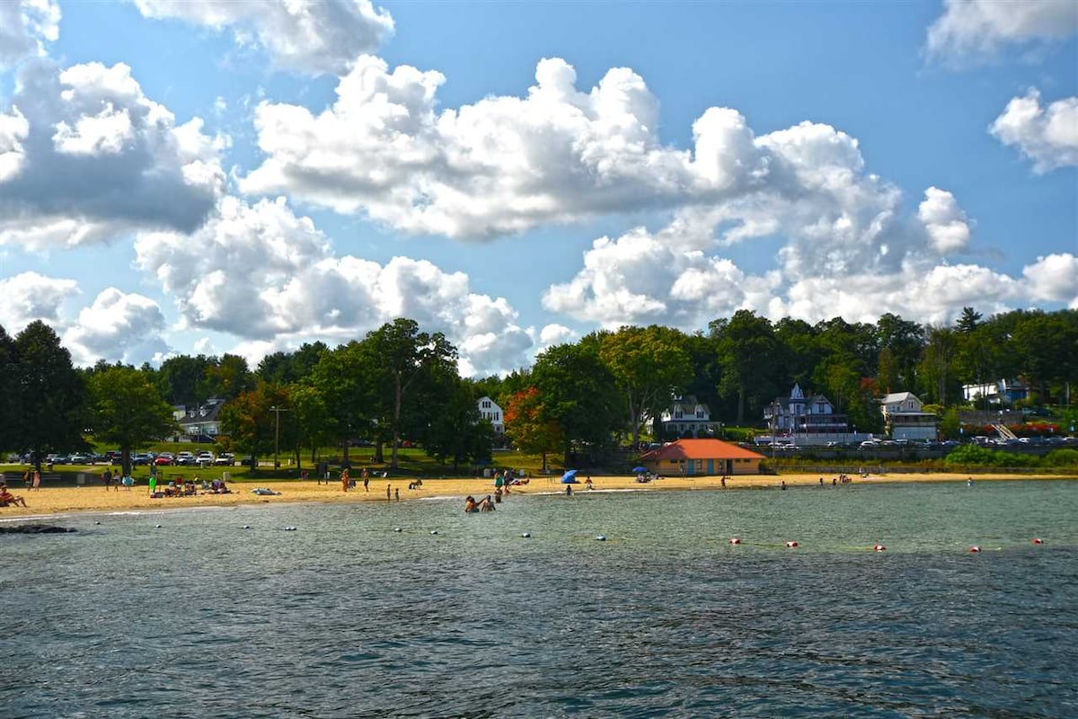 Explore o Lago Winnipesaukee DURANTE TODO O ANO! Esqui! Barco! Natação! Caminhada! Ou apenas RELAXE! Condomínio de um quarto no Misty Harbor Resort - espaçoso o suficiente para quatro. Planta baixa aberta com cama queen size, sofá-cama queen, cozinha completa, Keurig, TV de tela plana de 42 polegadas, cabo HD, ar-condicionado e lareira elétrica! Varanda privativa, vaga de estacionamento numerada, pequena quadra de basquete e tênis. Curta caminhada do outro lado da rua para 335 pés da praia arenosa de Misty! Caminhada mais curta até o Pavilhão!