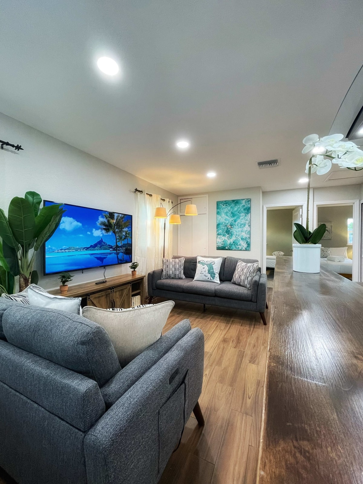 2 quartos/2 banheiros completos. O quarto tem banheiro privativo. Perto da praia, Wi-Fi de alta velocidade., Jardim tropical cercado privado com grelha, conjunto de pátio. Pátio da frente privado. Muito confortável para 4. Espaço para mais 2 hóspedes com sofá-cama queen. Ótima localização, apenas 2,5 quarteirões da praia. Todas as conveniências de casa Cozinha totalmente equipada, balcão ilha com design aberto para entreter... 3 Smart TVs 2- 32", 1- 48". Estacionamento gratuito e lavanderia Mês ou estadias mais longas 30% de desconto. 6 carregadores de veículos elétricos nas proximidades