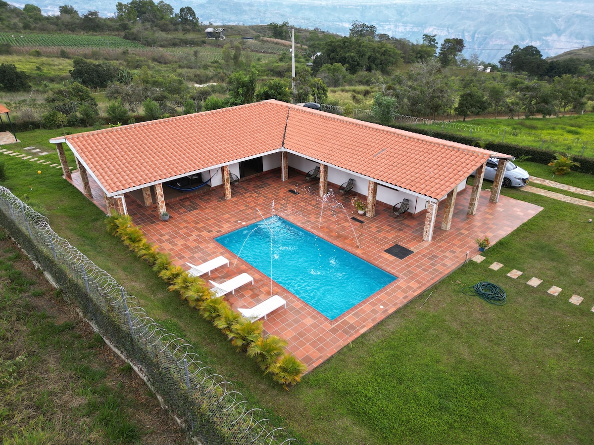 Tenha calma neste refúgio único e tranquilo com vista espetacular para o Canyon Chicamocha e o rio, New Chalet, totalmente equipado, Forno Artesanal, Redes, Cadeiras de Foguete do Texas, Chuveiro Natural Aberto com vista para o Canyon, Café da manhã incluído, Jardim próprio, churrasqueira e lareira, além de desfrutar da caminhada nas estradas rurais ou caminhar dentro da fazenda, desfrutar das plantas de café e poucas árvores frutíferas e horta. Desfrute do seu retiro privado no cânion...