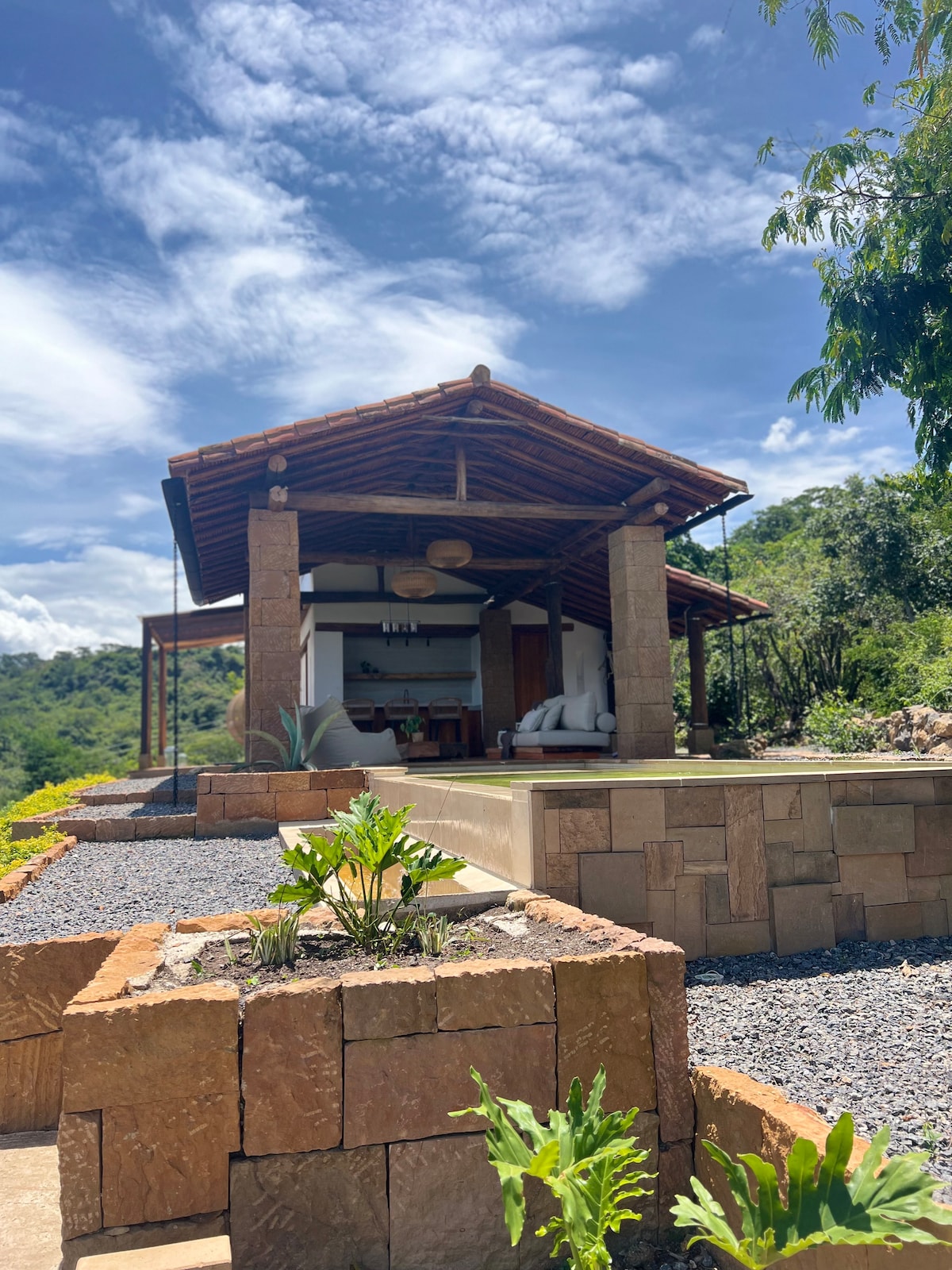 Casa de campo de conceito aberto cercada pela natureza, com vista para a montanha. Perfeito para relaxar, desfrutar da luz do nascer do sol e saborear café em paz. Um espaço calmo para trabalho remoto, retiros pessoais, compartilhar com a família ou simplesmente descansar em total privacidade. O lugar perfeito para passar sua temporada se sentindo em casa. Vistas para a🏞️ montanha Área de🧘 ioga e meditação 🌞 Luz do sol matinal ☕ Cantinho do café 🏊 Piscina privativa 📶 Wi-Fi e privacidade total