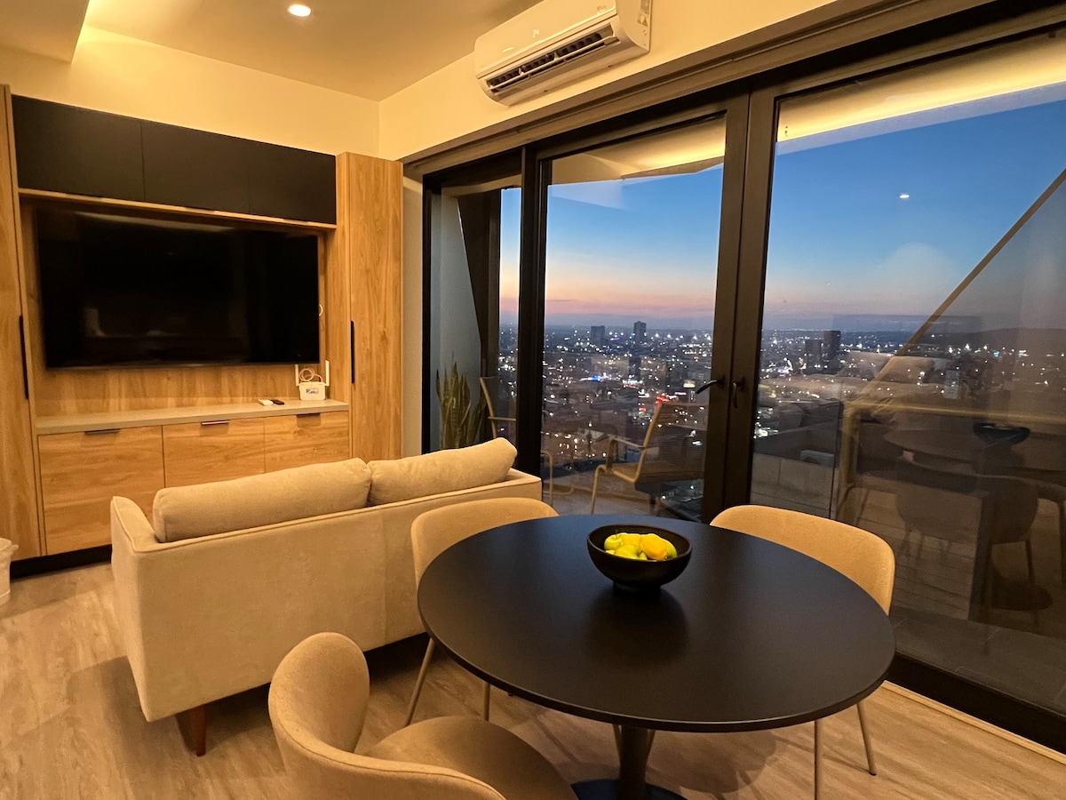 Desfrute de uma experiência elegante nesta acomodação localizada a 10 minutos da encruzilhada internacional de carro, a 10 minutos da área turística a pé. Com vista para o centro de Tijuana. Perto de cafés e restaurantes na região. Confortável e seguro para caminhadas, com segurança interna 24 horas. O apartamento tem duas varandas e excelente iluminação, janelas do chão ao teto com persianas blackout para maior controle da iluminação.