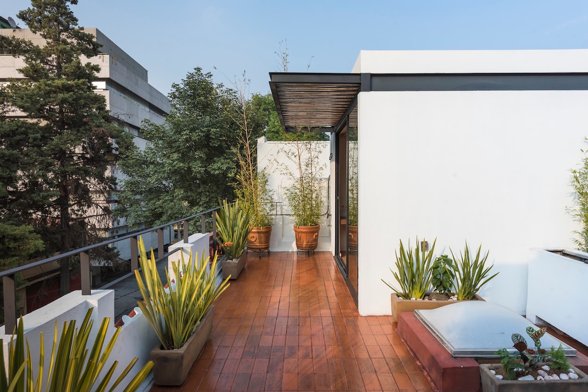 Imagine a bela Cidade do México e seus pores do sol rendidos aos seus pés, começando o dia com um café aromático e um delicioso despertar! Um espaço único para celebrações de amor, escapadas românticas ou reconciliações. Você pode até usá-lo como um cenário para fotos. ✅ Vigilância, estacionamento e serviço de limpeza diária, ✅ OBSERVAÇÃO: Você entra pela área comum, construída em nosso jardim privado no telhado. ✅ Monumental Plaza de Toros e Pepsi Center (UBER 10 min)