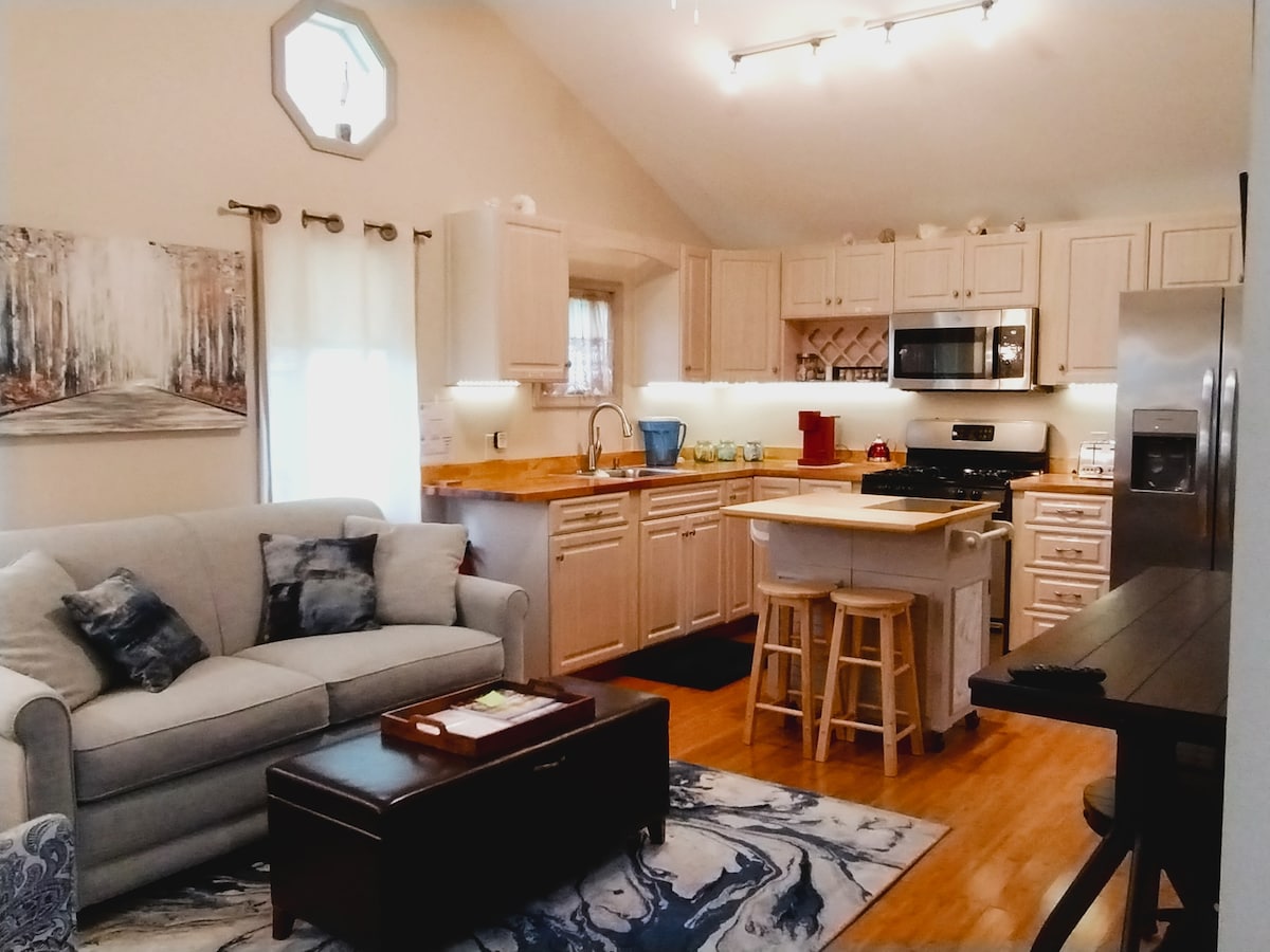 A minha Airbnb é uma casa de campo separada na minha propriedade pessoal. A casa de campo tem uma sala de estar, cozinha, área de jantar, banheiro com chuveiro e um quarto grande com uma cama queen size e um berço de solteiro. Ele também oferece uma máquina de lavar e secar roupa em tamanho real, geladeira em tamanho real, tábua de passar roupa e ferro, micro-ondas, torradeira, cafeteira e TV de tela plana. Também forneço todos os lençóis e toalhas limpas. Não É PERMITIDO FUMAR dentro ou na propriedade!