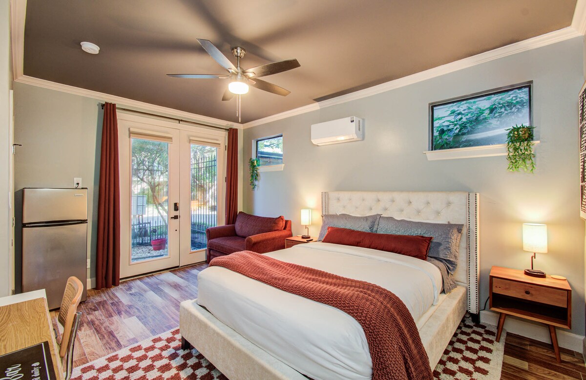 The Rustic (#3): Spacious, chic, impeccably designed studio in a newly-remodeled complex of 7 distinct, state-of-the-art apartments with brand new EVERYTHING. The Rustic is one of 2 large anchor studios with a full kitchen & separate living & sleeping areas. Plush, king-sized mattress & bedding; homey, comfy decor; ample lighting; smart technology; brand-new appliances. Amazing centrally-located neighborhood just steps away from some of Houston's best restaurants & nightlife...
