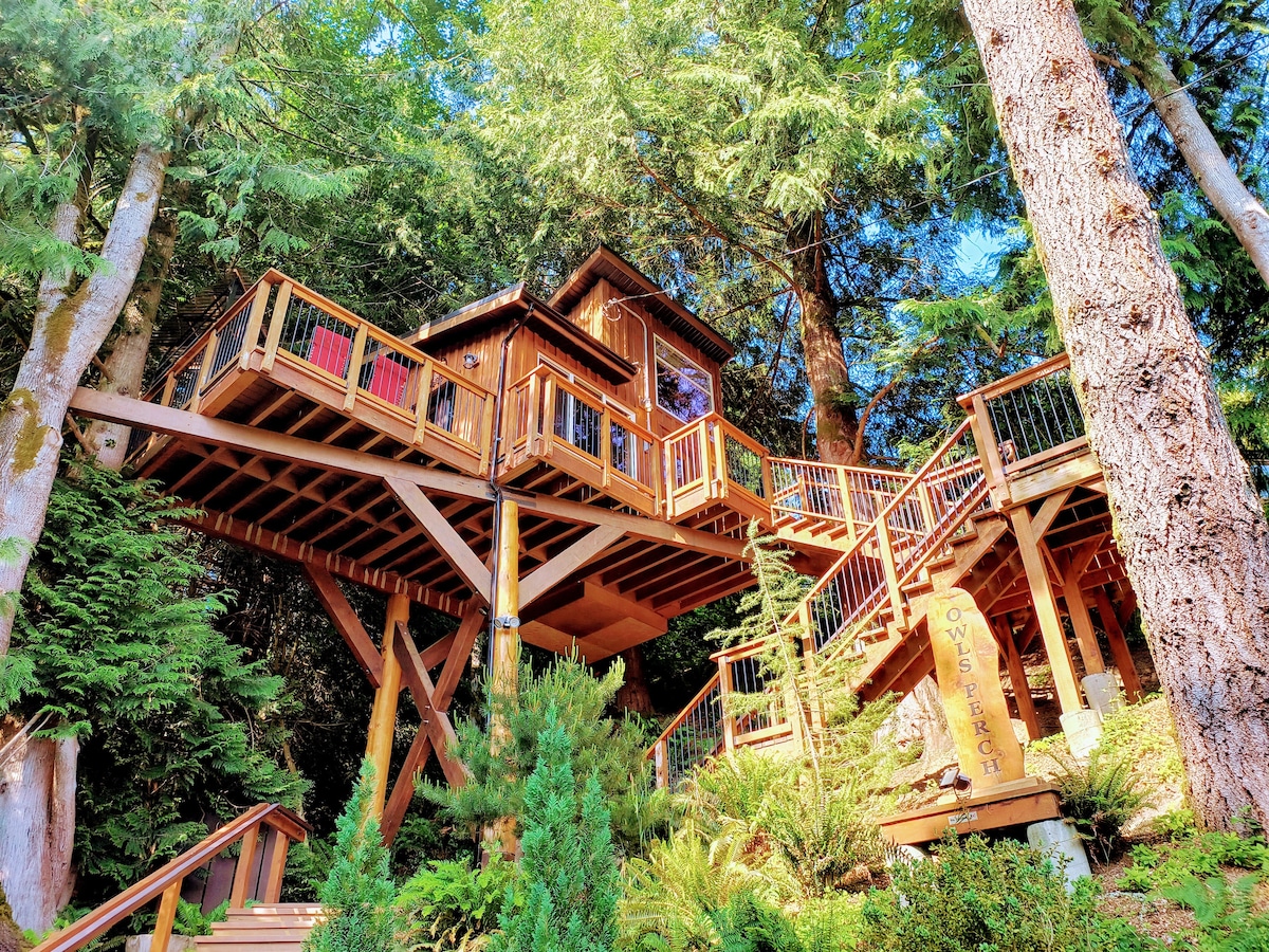 Uma casa na árvore verdadeiramente única situada a 30 pés de altura entre as árvores. Esta estrutura incrível está anexada a 3 grandes cedros e 1 bordo gigante usando guias de árvores avançadas que permitem que as árvores balançem suavemente, proporcionando uma experiência natural e imersiva. O grande deck oferece vistas deslumbrantes do Mar Salish até as Montanhas do estado de Washington. Com todas as comodidades modernas que você poderia precisar, é o lugar perfeito para relaxar e descontrair. Experimente a magia e a maravilha da vida na casa da árvore por si mesmo!
