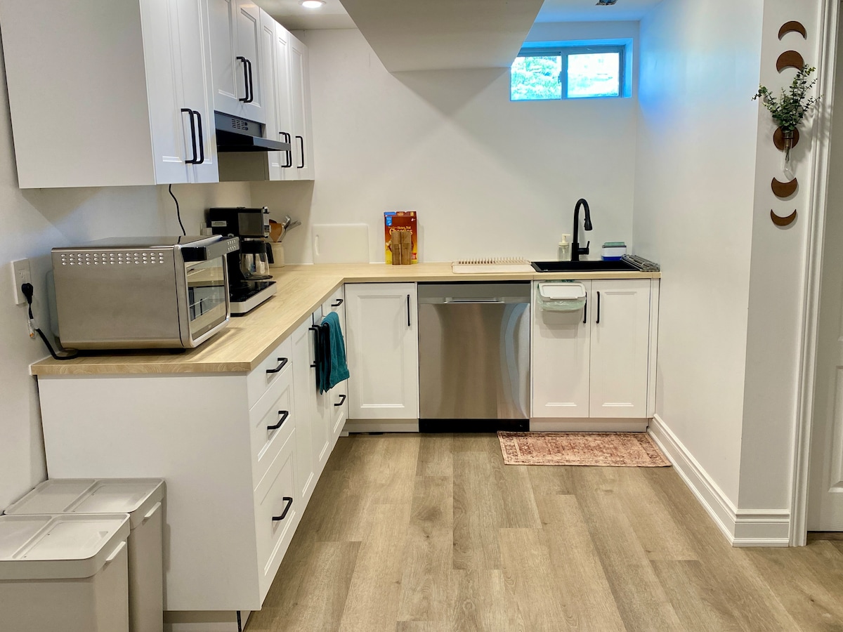 Suíte de porão privativa, tranquila e adequada para animais de estimação, projetada para conforto e estadias fáceis. Apresenta uma cama queen size, sofá-cama, cozinha totalmente equipada, área de jantar, lavanderia no banheiro, acesso Wi-Fi gratuito e café e chá de cortesia. Os hóspedes desfrutam de um quintal compartilhado com uma piscina sazonal e churrasqueira no verão. Amado por sua privacidade e conforto, estando a poucos passos de um parque, mercearia, farmácia, banco e restaurantes próximos — perfeito para estadias curtas ou prolongadas.
