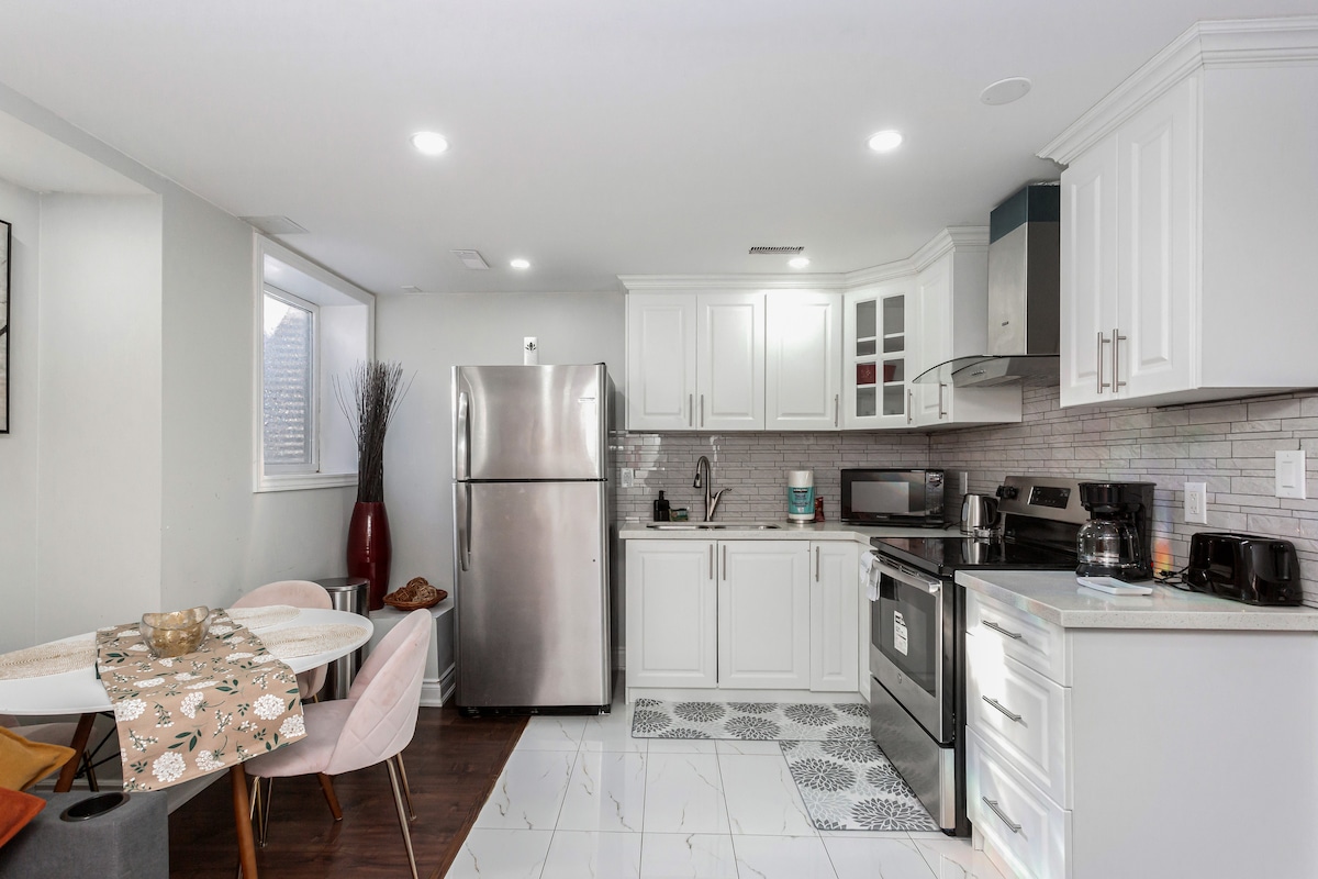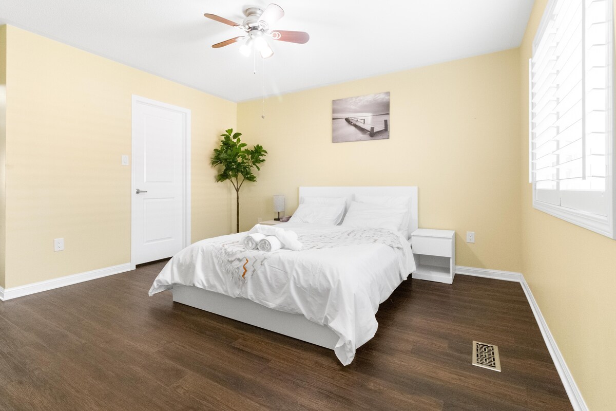 Desfrute de uma estadia tranquila em nossa suíte privativa de 2 quartos no porão legal, localizada em um bairro tranquilo de Milton. Com um layout de conceito aberto com tetos de 8,5 pés e quartos confortáveis, é ideal para casais, famílias ou estadias mais longas. A poucos minutos do Toronto Premium Outlets, Velodrome, trilhas cênicas e fácil acesso a Oakville, Burlington, Mississauga e Aeroporto de Pearson.