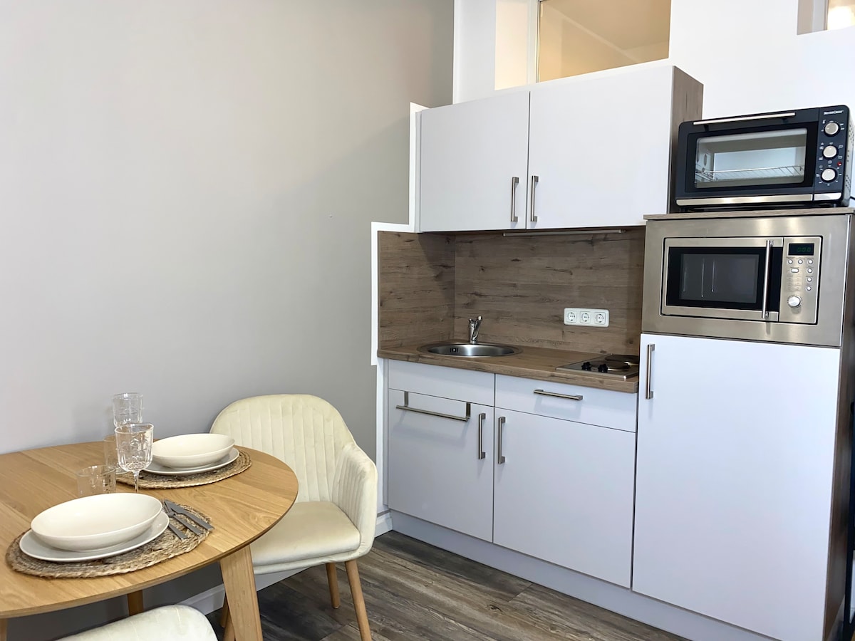 Cozy 25 m² city apartment in the heart of Minden – modernly furnished with double bed, Smart TV, and dining/work area. High-speed Wi-Fi up to 125 Mbps incl. Kitchenette with fridge, induction hobs & mini oven, bathroom with shower & towels. Restaurants, cafés, old town & train station within walking distance. Perfect central location yet a quiet retreat.