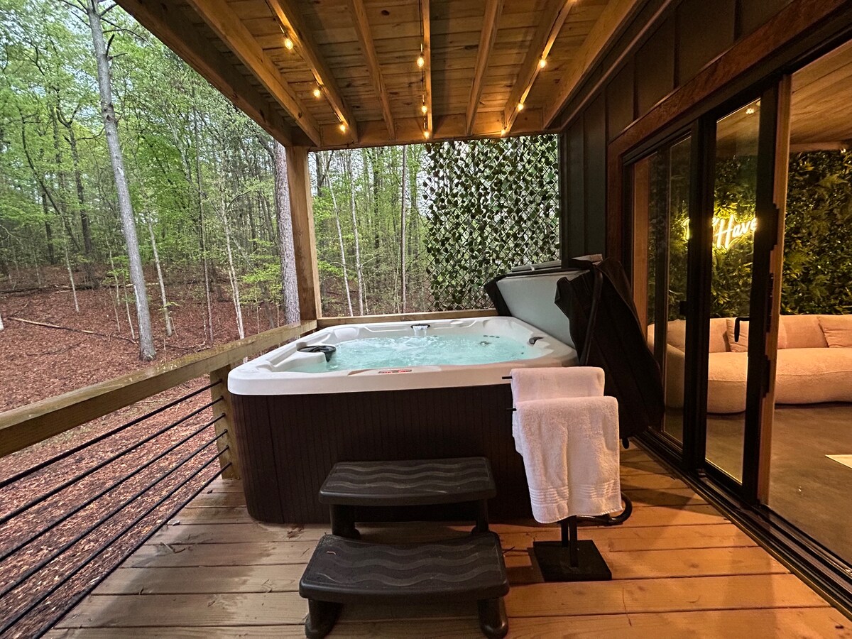 NOVA cabana com decks florestais, banheira de hidromassagem, jogos de arcade