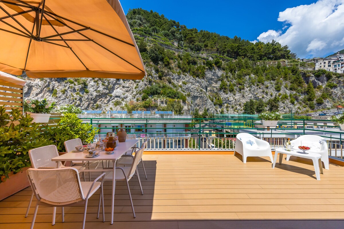 Regional License Code 15065104EXT0209 CIN : IT065104C2NOHBAH4M A lovely terrace with exclusive use,to live in complete relaxation,of 150 square meters, swimming pool ,outdoor shower with hot and cold water, barbecue,free wi-fi ,lift, free parking space in the structure,the descent to private beach (shared with other 4/5 guests) with access permitted from May 15th ,air conditioned rooms, and proximity, 500 meters,the center of the village of Minori,constitute the strengths of this apartment
