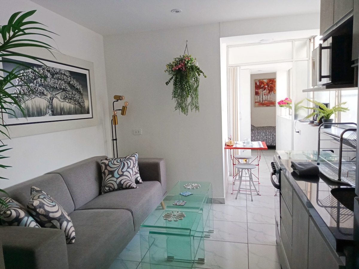 Apartamento novo, espaçoso e totalmente equipado a apenas 350 m da orla de Miraflores. Perfeito para relaxar, trabalhar ou desfrutar de uma experiência de cinema em casa com seu projetor HD e tela automática. Dispõe de 2 quartos (principal com cama queen size e Smart TV 4K), uma aconchegante sala de estar com sofá-cama queen size e uma varanda com vista lateral para o mar. Wi-Fi de alta velocidade de 100 MB. Temos estacionamento. Localização privilegiada perto de Larcomar, cafés, museus e restaurantes.