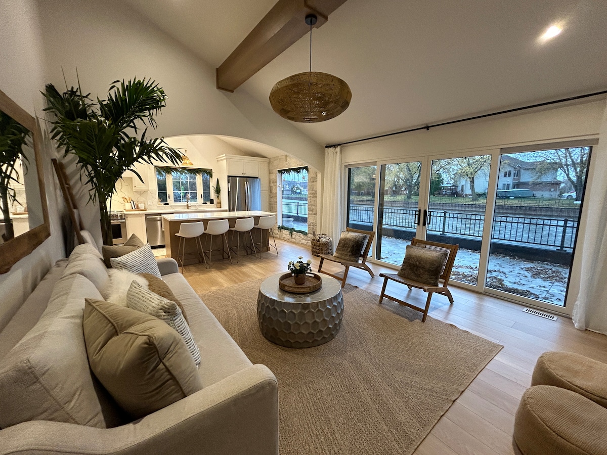 Chalé Executivo Moderno à beira-mar com muita luz natural e vistas deslumbrantes. Esta casa de campo é um sopro de ar fresco e oferece todos os confortos e conveniências que você precisa em uma escapada luxuosa e relaxante. A casa de campo possui um layout único que acomoda 4 pessoas com uma cozinha totalmente abastecida e dinette, quarto principal, um segundo quarto eclético, portas de celeiro, Smart TV e muito espaço no armário, lareira a gás, piscina e quintal gigante à beira-mar com acesso ao lago para nadar.