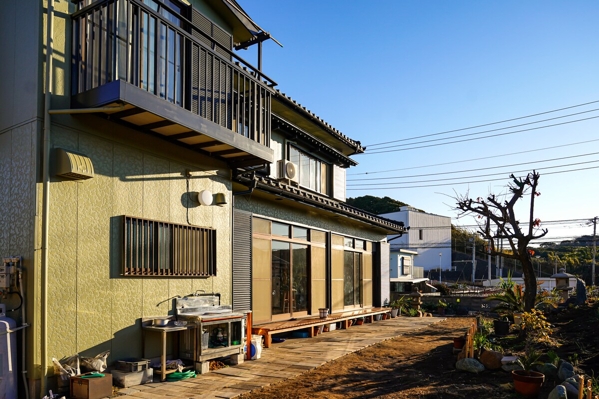 Misaki Cho está localizado na ponta da Península de Miura.Uma casa de hóspedes moderna de estilo japonês com vista para um porto de pesca nostálgico e tranquilo.O terraço oferece uma vista panorâmica do oceano tranquilo.Cozinha totalmente equipada, limpa e simples.Banheiro com concreto e banheira branca.Há um litoral natural muito bonito a uma curta caminhada de distância.O quarto tem 2 quartos, 1 cama de casal e 2 camas de solteiro.A sala de estar tem um sofá e uma mesa grande onde todos podem relaxar.É uma antiga casa de hóspedes privada onde você pode passar seu tempo em família ou em grupo.