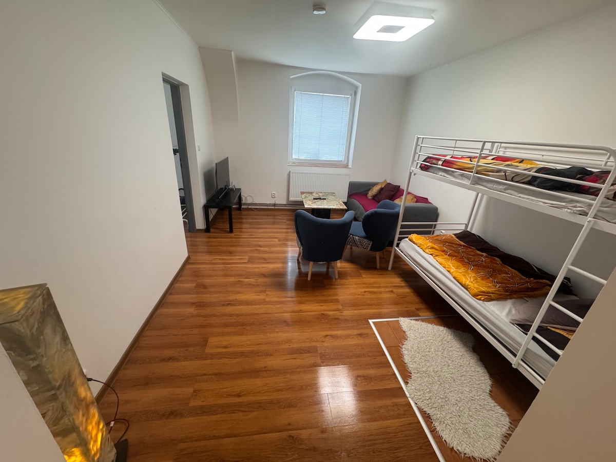 Apartamento perto do Bohemian Paradise em uma vila tranquila com comodidades cívicas completas perto de Mladá Boleslav com estacionamento ao lado da casa. Possibilidade de viagens, esportes e relaxamento. Faz parte de uma casa de família onde moro com meus filhos, com entrada privativa. Suas visitas nos ajudam a pagar uma hipoteca alta da casa. Obrigado. A partir de 30.8.2024, destaca-se uma luxuosa cama de casal de carvalho.