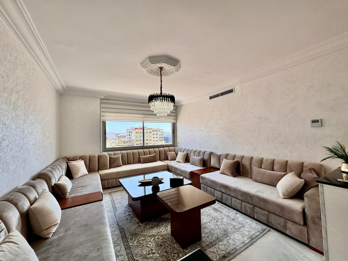 **Merci de lire la description jusqu’à la fin** Découvrez notre charmant appartement à Tanger, idéalement situé dans un complexe fermé et sécurisé, à deux pas du Movenpick, du Casino de Tanger, ainsi que des cafés et restaurants. Profitez d’une magnifique terrasse spacieuse avec vue imprenable sur la baie de Tanger, parfaite pour un café le matin ou un apéritif au coucher du soleil. Idéal pour couples et familles en quête d’une escapade inoubliable.