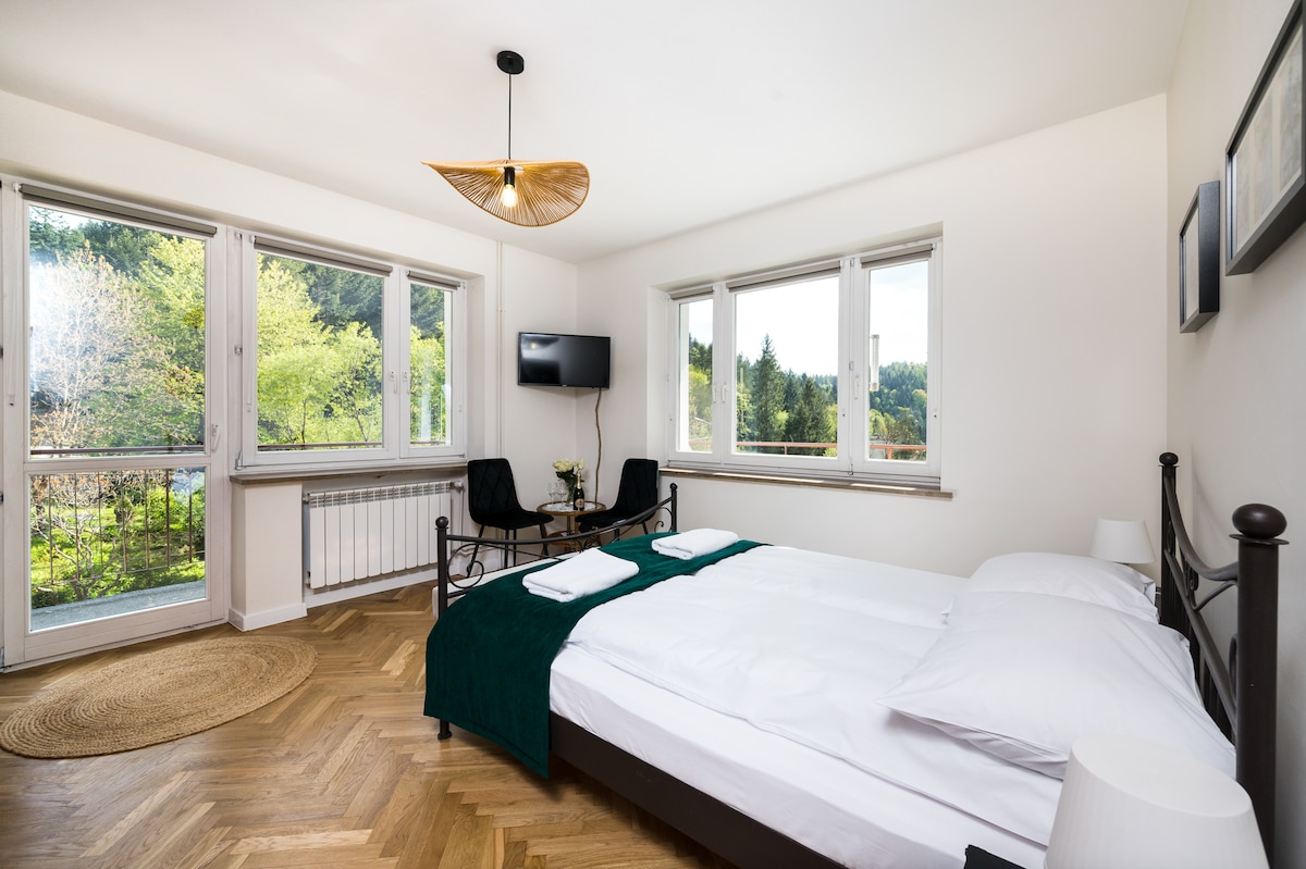 Komfortowy, znakomicie wyposażony apartament z 1 SYPIALNIĄ, oddzielną kuchnią i balkonem z pięknym widokiem na las i góry. Idealny dla pary lub osób podróżujących służbowo. Apartament mieści się na 1 piętrze kameralnego i całkowicie odnowionego budynku składającego się z 6 mieszkań, które są dostępne tylko dla naszych Gości. SUPER LOKALIZACJA –Spokojna i zielona okolica, cicho, bezpiecznie! 20 minut spacerem do Centrum Miasta i na Deptak.