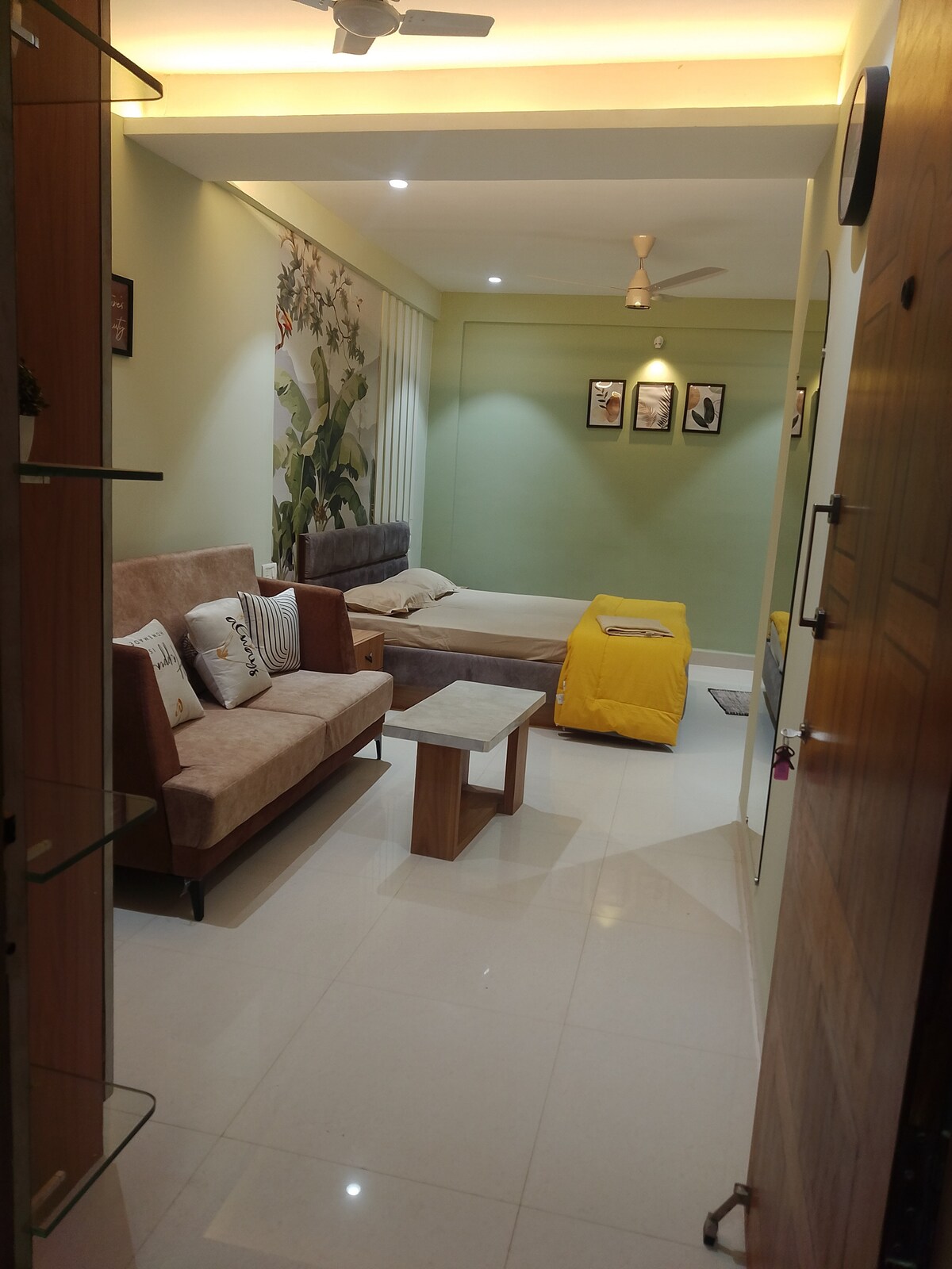 Features & Amenities: - Wi-Fi, Geysers in bathrooms with western commode - Oven, Refrigerator, TV, Washing Machine, Water filter, Chimney and Gas Stove - Kitchen utensils - 24-hour water - Open car parking space, Lift access and CCTV surveillance -AC usage extra charges applicable Location Highlights: Nestled in a serene locality surrounded by greenery, the apartment offers a calm and refreshing environment. Each room comes with a balcony, ensuring excellent ventilation and natural light.