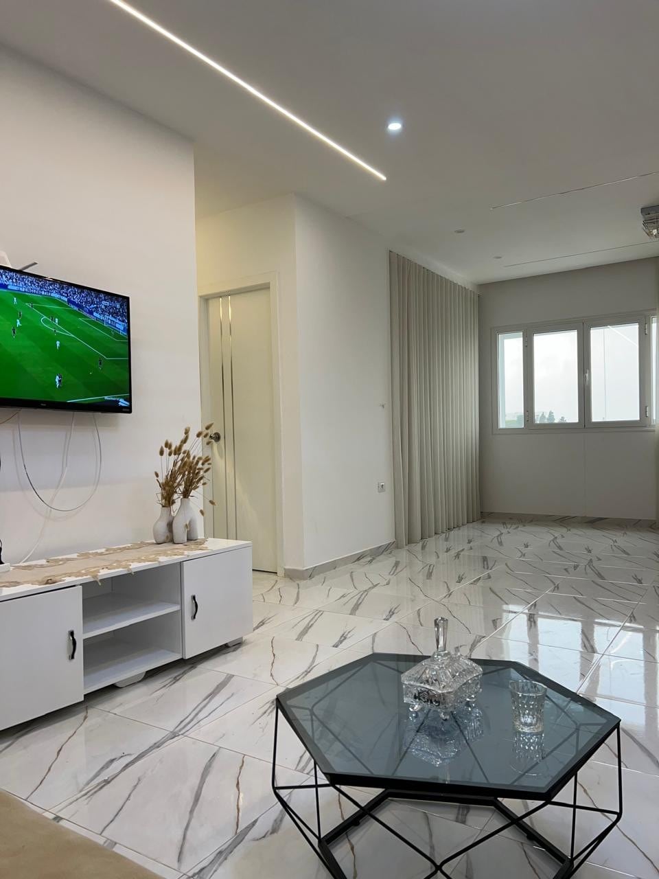 Apartamento de design de alta qualidade de 120 m² (interior de 70 m² e terraço de 50 m²), totalmente equipado e idealmente localizado num bairro tranquilo de Monastir. O terraço, mobiliado com móveis de jardim, um guarda-sol e plantas exóticas, é perfeito para relaxar. Este apartamento espaçoso, moderno e luminoso é ideal para estadias confortáveis, seja em casal ou com amigos. Perto de comodidades e praias, oferece um ambiente único para explorar Monastir.