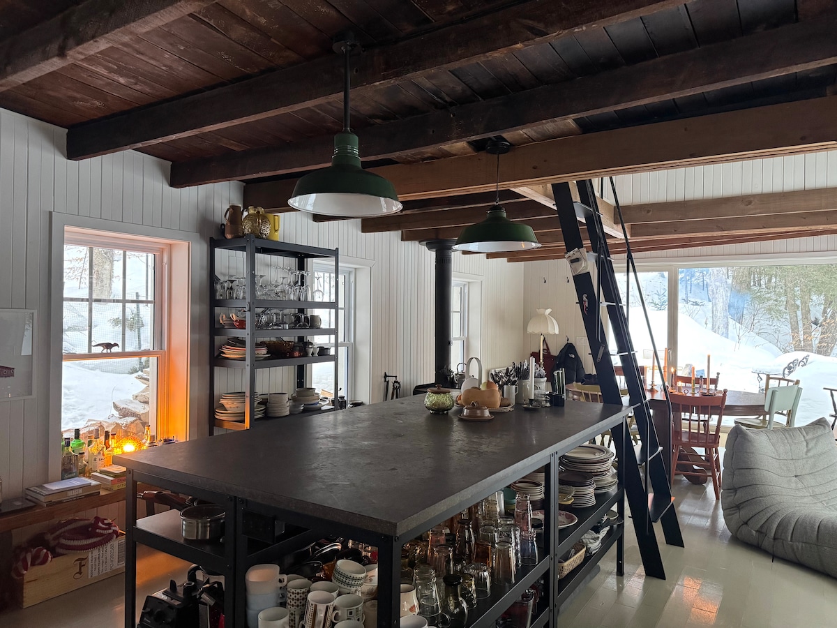 Esta casa recém-construída está localizada em nossa propriedade de 90 acres. Está cercada por um pomar, um vinhedo e floresta. O cenário pitoresco e natural é perfeito para casais, viajantes individuais ou famílias. Esqui cross country, corrida e caminhadas podem ser praticados na propriedade. As pistas de esqui alpino de Bromont e Sutton ficam a 35 minutos de carro. Jay Peak, Vermont fica a 1h15 de carro. As estradas rurais circundantes proporcionam passeios de bicicleta maravilhosos.