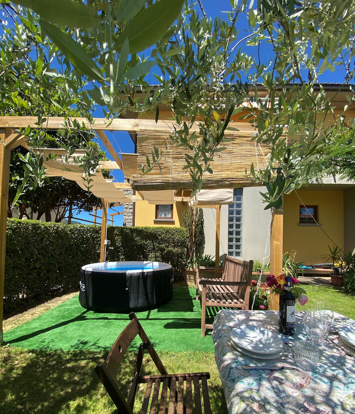 This quaint cottage was once used as a barn, and still maintains the old stone walls, terracotta floor and exposed beamed ceiling. It has a decidedly rustic character but the period furniture, a family legacy, gives it personality and a certain distinction. Outside it has a covered area surrounded by a hedge, and all the space around - lawn and olive trees - equipped with table, chairs, bbq, umbrella, deckchairs and sun loungers.