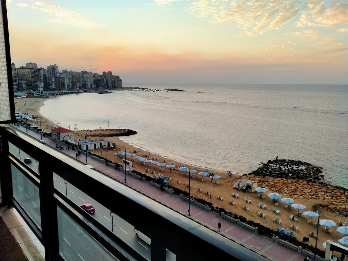 Um apartamento distinto na praia de Alexandria, na área de Montazah. É composto por três quartos com 6 camas, dois banheiros, um grande salão contendo uma sala de jantar, um salão e uma sala de estar. Além de uma vista para o mar em toda a largura do corredor. E uma grande varanda contendo um sofá e cadeiras feitas de vime e contas clássicas. O apartamento está localizado no nono andar, dando-lhe uma vista única da praia que você nunca verá antes.