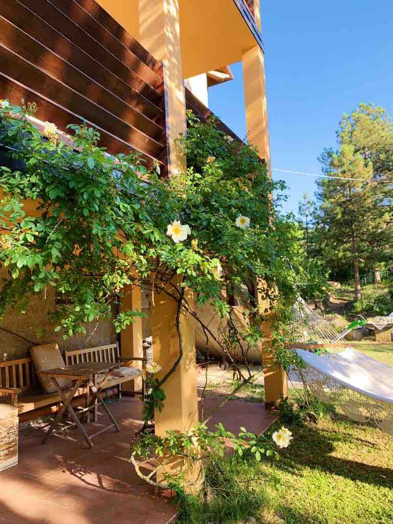 A casa, de origens antigas e única em seu gênero, tem uma estrutura dividida em vários níveis de tamanho modesto com ambientes originais e encantadores. No andar térreo, encontramos a entrada para a sala de estar e um banheiro com terraço. Subindo a escada, tem-se acesso à área de dormir com 1 quarto duplo com vista para o vale e 1 espaço aberto com beliche e janela com vista para a vila. No andar inferior, a cozinha completa com eletrodomésticos dá acesso ao jardim exclusivo e privado.