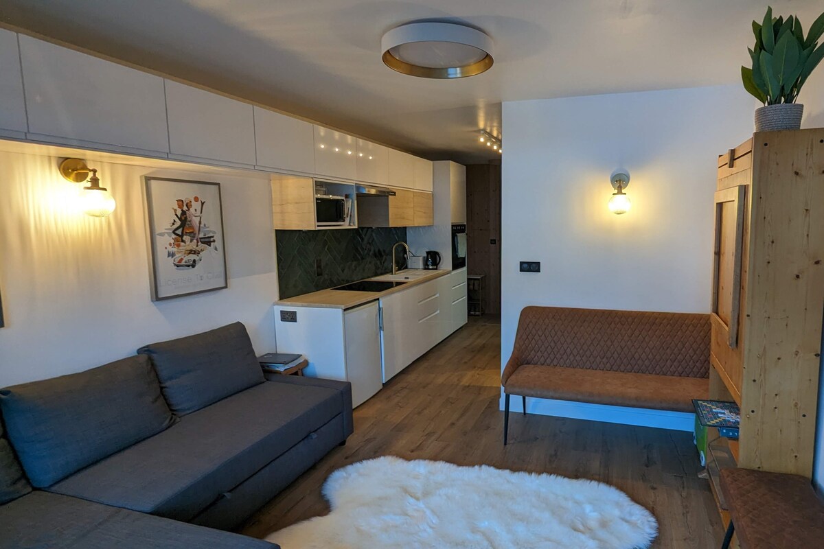 Recentemente totalmente renovado. Um apartamento iluminado, moderno e de 2 quartos que pode acomodar 6 pessoas. 1 quarto de casal, 1 beliche triplo e sofá-cama de casal. 7 minutos a pé do centro de Morzine, 2 minutos a pé da parada de ônibus de esqui e do supermercado principal Carrefour, então tudo o que você precisa está realmente perto. Nova cozinha com forno, fogão, máquina de lavar e secar roupa, máquina de lavar louça, panela elétrica, micro-ondas. Banheiro e chuveiro modernos Garagem e uma grande caverna de esqui segura. Lindas varandas com vista para Morzine e as pistas.