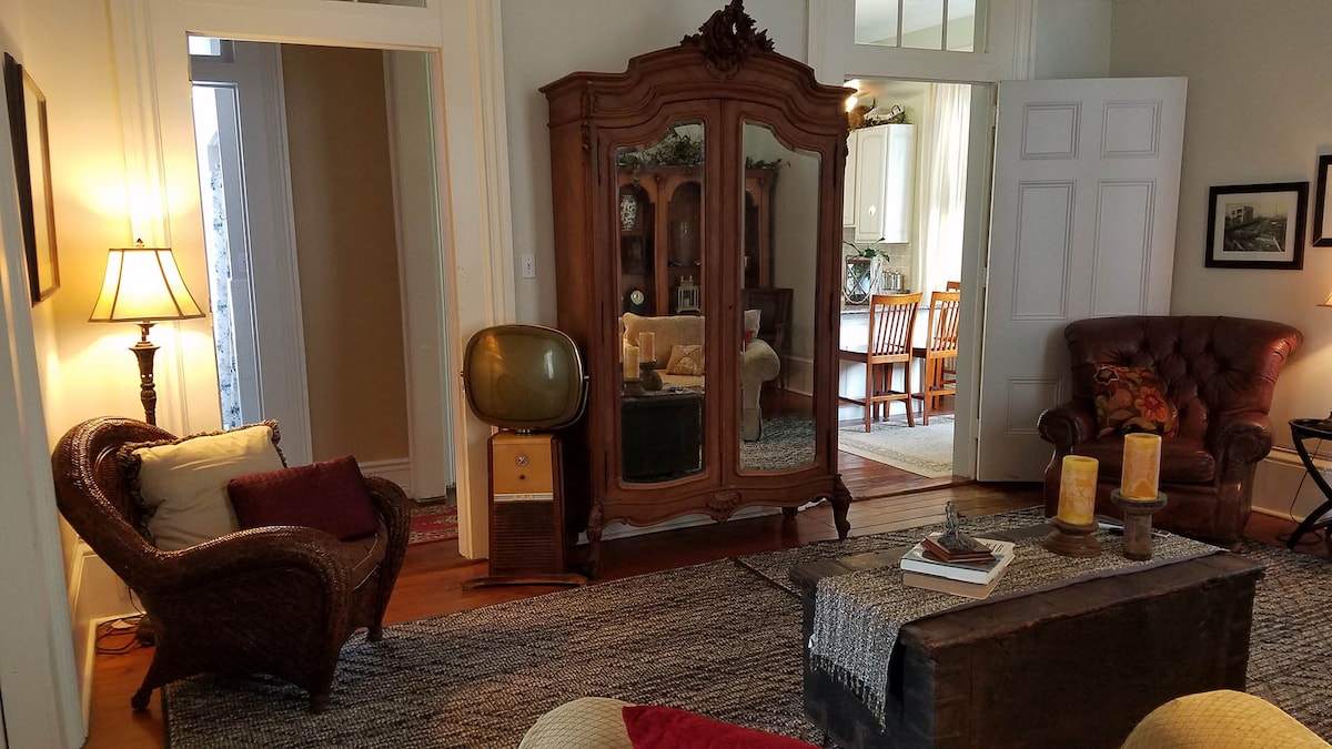 Mercearia Old Corner renovada na Cordray Drug Store no show "Restoring Galveston" na Magnolia. Este espaço de aluguel no andar de cima é completamente separado com sua própria entrada. O quarto tem cama Queen. A cozinha está totalmente equipada para cozinhar. Keurig com café, creme e açúcar fornecidos. A sala de estar tem Smart TV. Lava-louças! O espaço externo é compartilhado durante 12 a 6 horas úteis. Espere barulho no andar de baixo durante o horário de funcionamento da loja, das 12h às 18h, de terça a domingo.