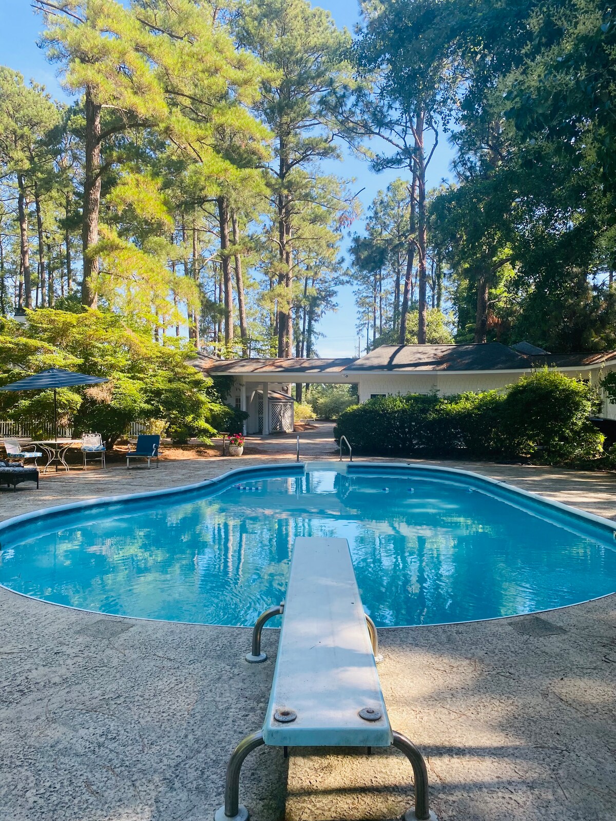 Welcome to our peaceful guesthouse in Southern Pines, NC! This contemporary retreat offers a serene escape with a pool, charming gazebo, and stunning views of the championship golf course, Pine Needles. The spacious unit is decorated in a modern style, providing a comfortable and inviting ambiance. Relax poolside or take a stroll through the well-manicured grounds. Golf enthusiasts will delight in the proximity to the renowned course. Discover tranquility and luxury in this hidden gem.