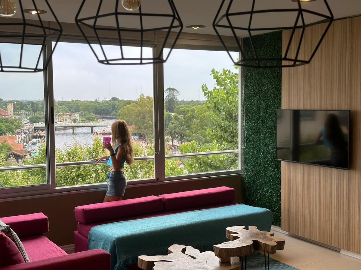 Este alojamento de 70 m2 tem muito espaço para você compartilhar com os seus enquanto desfruta de uma incrível vista de 9 metros de largura para o rio Tigre. Mesmo com chuva ou à noite, o espaço é aproveitado ao máximo porque você não se sentirá preso como em um apartamento convencional. Localizado na melhor área de Tigre, muito perto da estação de trem, dos parques, do cassino, da estação fluvial e em frente ao rio. Zona não inundável. Estacionamento no mesmo prédio