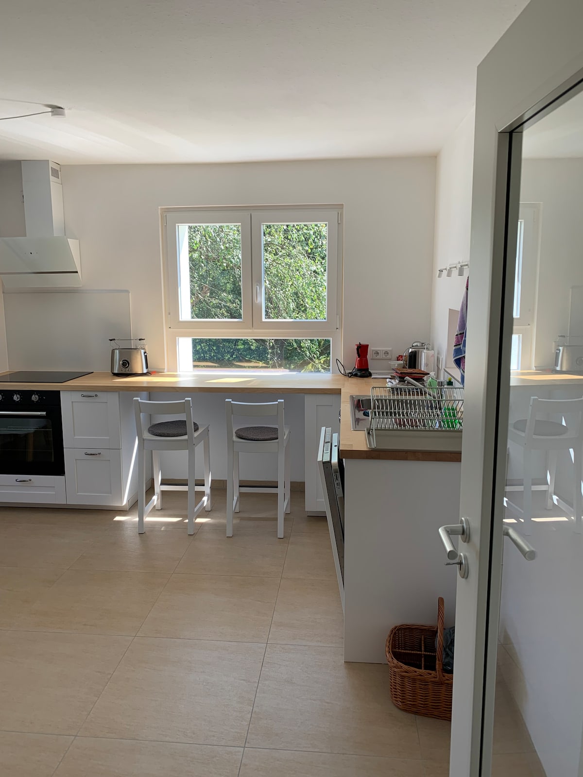 Meu apartamento está localizado a uma hora ao sul de Frankfurt, em meio à natureza. Bem adequado para grupos e famílias que procuram a natureza. Há uma bela área externa com áreas de estar confortáveis, playground, fogueira, uma grande cozinha de verão coberta, horta, mesa de pingue-pongue, bancada para crianças, uma oficina de cerâmica para fazer cerâmica, um piano na cozinha de 45 metros quadrados. Excelente clima de vida através de construção em madeira/barro.