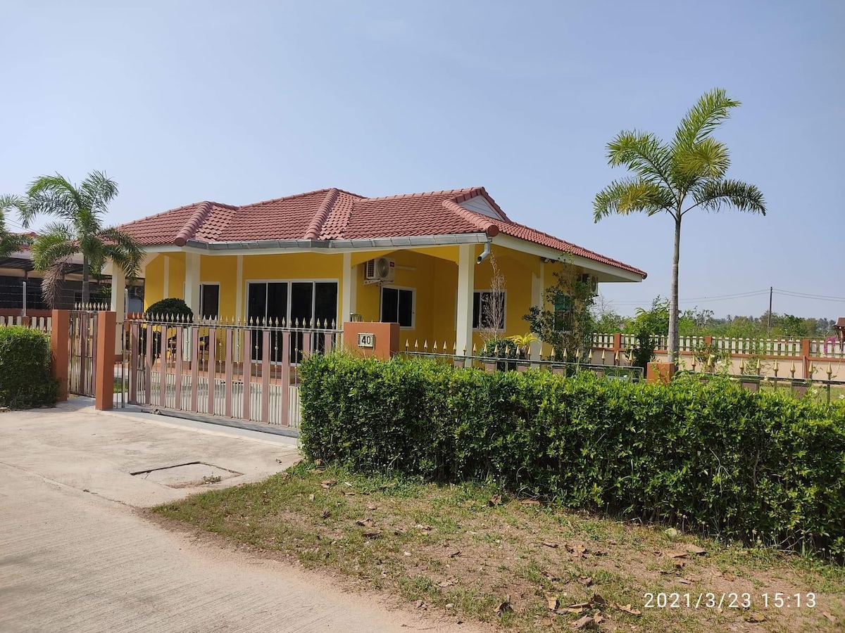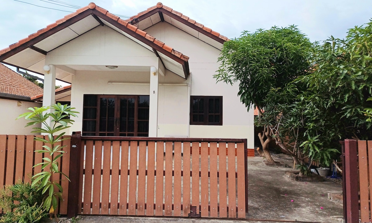 Este lugar inesquecível é tudo menos comum. A nova casa em Prachuabkhirikhan com um acabamento completo e uma área comum com Wi-Fi perto da praia de Ao Manao a apenas 8 minutos. Perto da rua a pé de fim de Ótimo para famílias 2 quartos 1 king size e cama de solteiro 1 banheiro e 1 tubo externo com chuveiro de efeito chuva 1 estacionamento privativo (gratuito)
