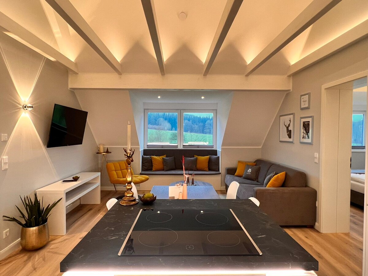 Novo prédio de apartamentos com 9 apartamentos atendidos na operação do hotel no meio da natureza e ainda centralmente. O apartamento está localizado no 1º andar e está distribuído em uma área de estar/jantar com sofá-cama (tem um colchão), um quarto com cama de casal e uma casa de banho à luz do dia com chuveiro. Aproximadamente 50 m2. O apartamento está inundado de luz. Você tem uma bela vista panorâmica diretamente da reserva natural adjacente. O apartamento está modernamente mobilado com um excelente conceito de iluminação.