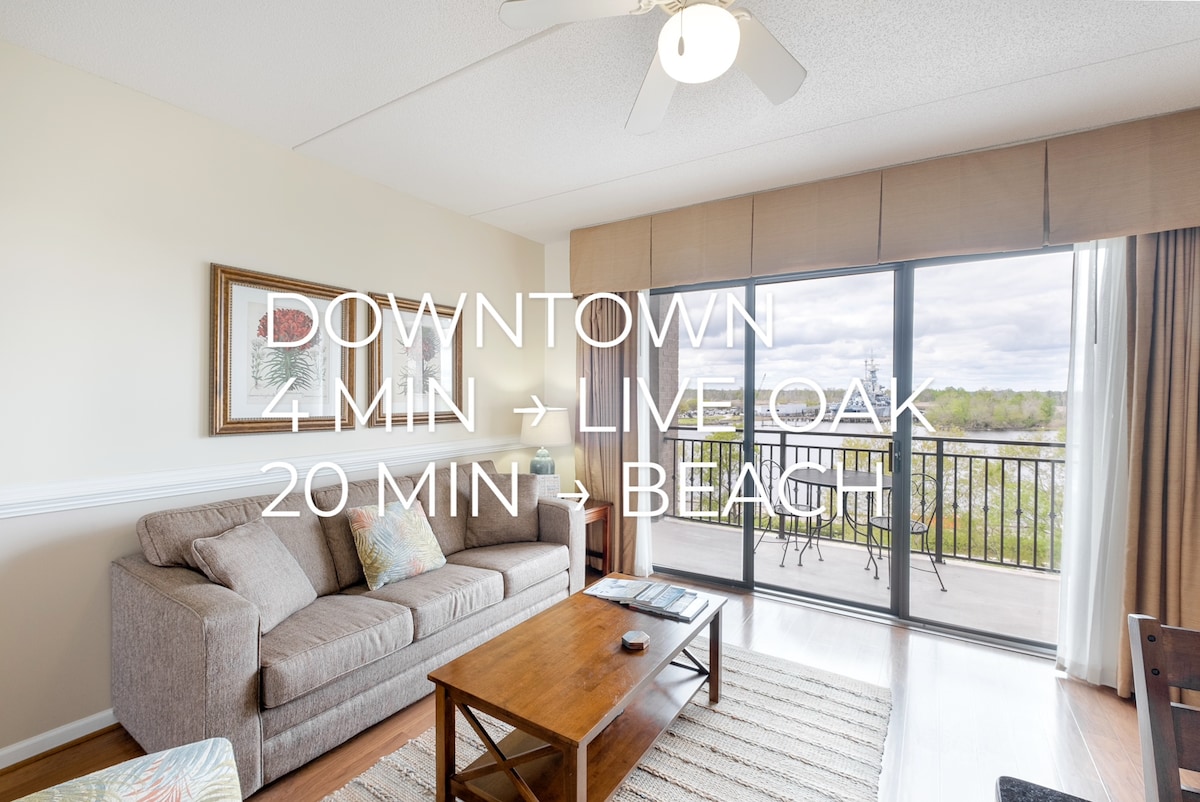 Condomínio privado no 5º andar com varanda + estacionamento no centro da cidade, próximo à UNCW e à praia. ★ "Localização fantástica e o condomínio estava limpo. Altamente recomendado!" Varanda ☞ privada com assentos ao ar livre ☞ Cozinha totalmente abastecida e equipada Estacionamento em garagem ☞ fora do local (1 carro) Lavadora ☞ no local + secadora ☞ Espaço de trabalho exclusivo ☞ Smart TVs (2) Wi-Fi de ☞ 328 Mbps 4 minutos → ao vivo no Oak Bank Pavilion → Praia de 20 minutos ★ "As vistas são incríveis. Perto de tudo no centro da cidade."