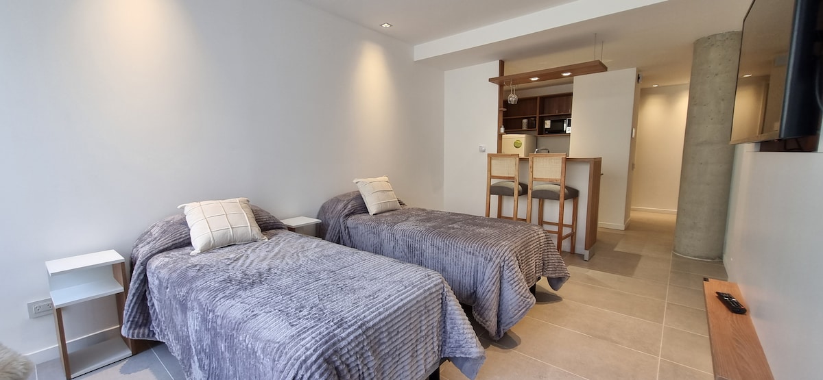 Lindo apartamento grande ideal para 4 pessoas. Decorado com estilo, totalmente equipado e novo. Localizado a 150 metros da Rua Principal (San Martin). Oferece dois quartos: um com banheiro privativo.
