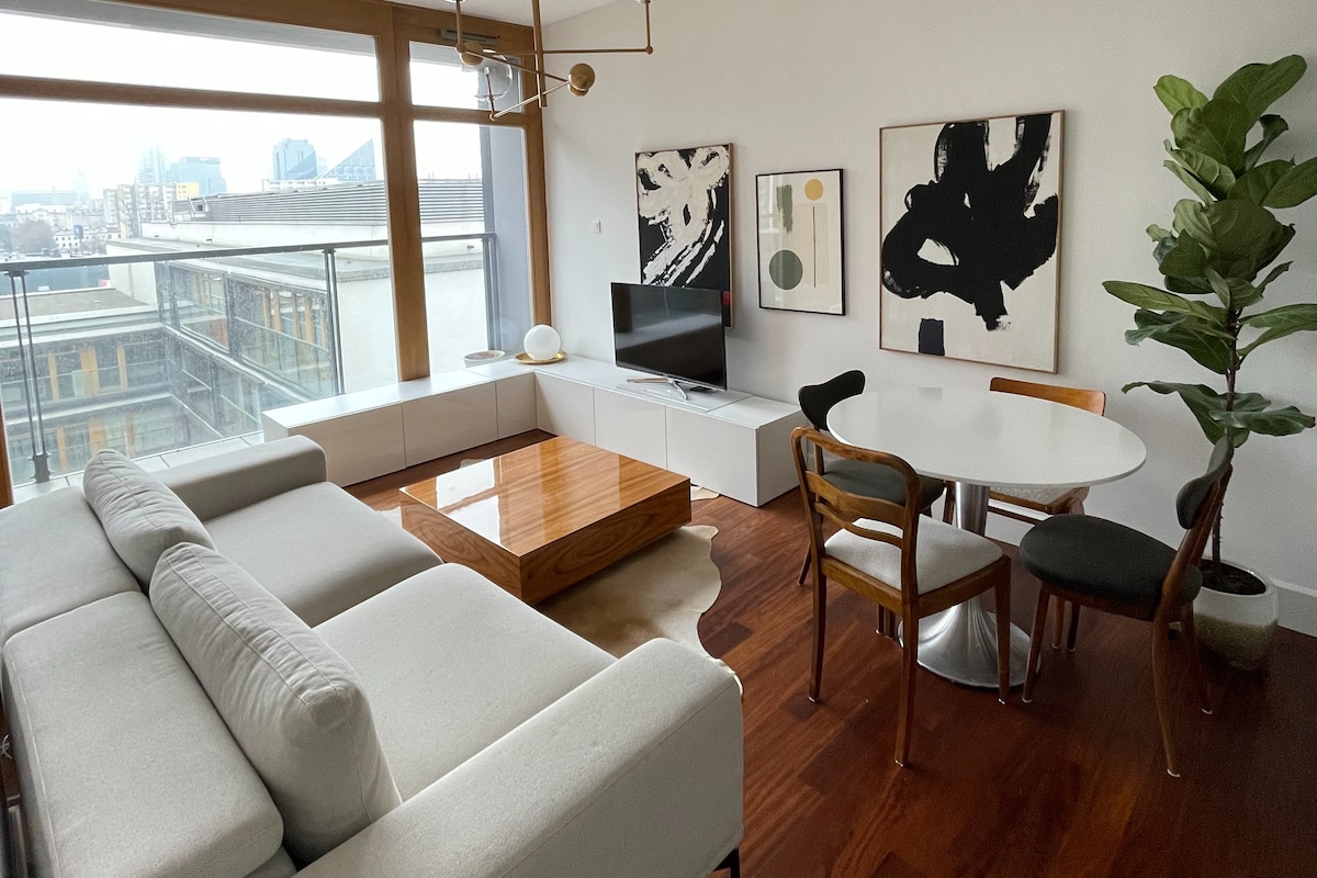 Apartamento moderno de 40 m2 com ar condicionado, com vista para os prédios de escritórios próximos do centro de negócios de Varsóvia, criando uma iluminação noturna impressionante. Este é um lugar único, onde ruas vibrantes com restaurantes e pubs da moda se encontram com lugares atmosféricos e cheios de história - restos de fábricas do pré-guerra ou cortiços do gueto judeu.