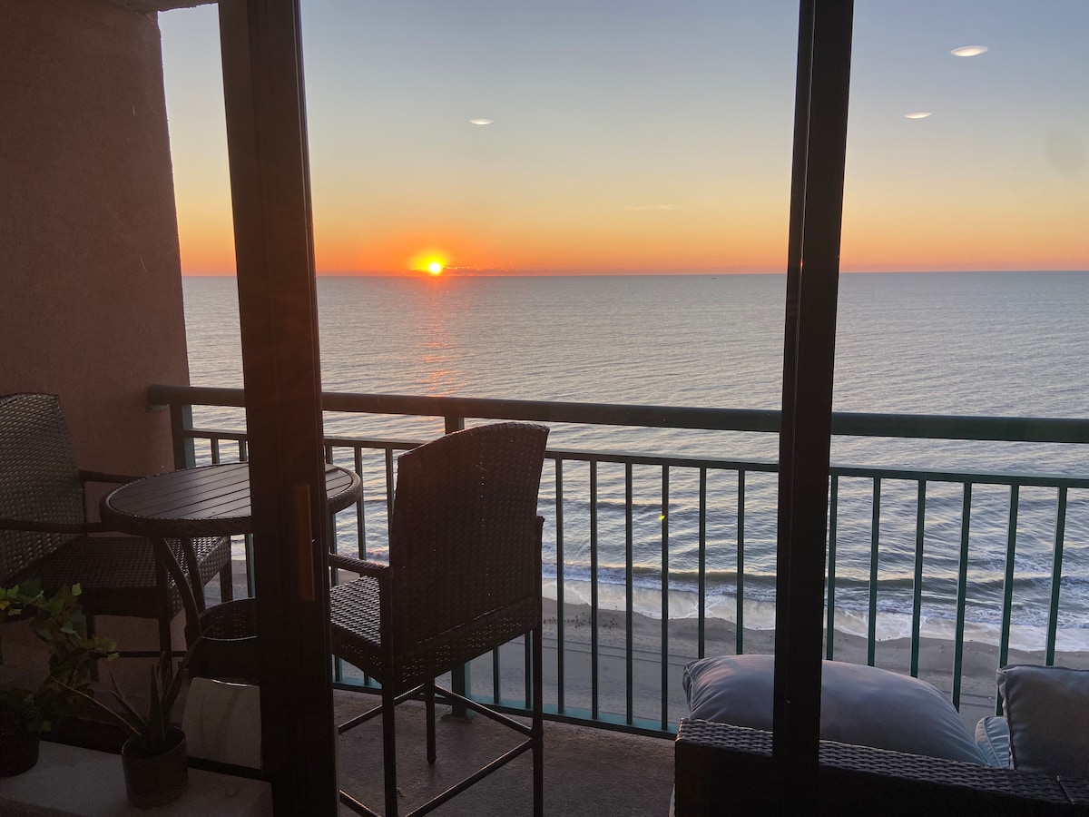 Este estúdio à beira-mar no 7º andar oferece uma vista deslumbrante para o oceano. A partir do momento em que você entra, seus olhos são atraídos para o mar aberto, calmo, infinito e relaxante. Se você está perseguindo o nascer do sol, longas caminhadas na praia ou um lugar para recarregar as energias, este condomínio elegante oferece tudo o que você precisa para uma escapada perfeita à beira-mar! Uma cama king size com lençóis limpos oferece um lugar confortável para relaxar. Passe o tempo na sua varanda privada, onde você pode assistir as ondas chegarem!