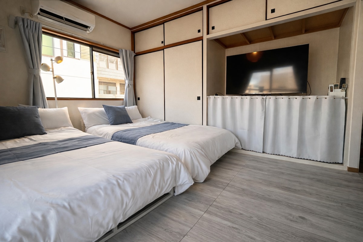 Yume-no-Tatsuyado Benten, uma pousada limitada a um grupo por dia, está localizada nas ruas tranquilas de Nagasaki, onde a brisa do porto e as luzes da cidade se misturam À noite, você estará cercado pela luz suave e pela atmosfera de Nagasaki. Cerca de 10 minutos a pé até o Estádio da Cidade de Nagasaki. Localização conveniente para assistir futebol, eventos e passeios turísticos. O edifício tem uma sauna privativa, onde você pode relaxar sua mente e corpo depois de assistir ao jogo ou caminhar pela cidade. Cães pequenos (até 10 kg, até 2 cães) também são bem-vindos.Desfrute de um momento caloroso com sua família e amigos, cercado pelas luzes de Nagasaki. ◾️Quarto Quarto 1: 2 camas semi-duplas, 1 cama de solteiro * Uma cama de ar (casal) pode ser configurada na sala de estar, se necessário ◾️ Instalações: TV, geladeira, ar condicionado, chaleira, micro-ondas, máquina de lavar roupa, secadora, sauna (baixo calor disponível, máquina de gelo (para banho de água), espaço de banho interno), comodidades (toalhas, escovas de dentes, xampu, sabonete corporal, secador de cabelo, etc.) Serviços ◾️gratuitos Wi-Fi / 1 vaga de estacionamento (limite de altura 1,98 m) Opcional ◾️por uma taxa Conjunto de sauna de bola de gel (não disponível para retirada) * Os detalhes estão listados nas regras da casa