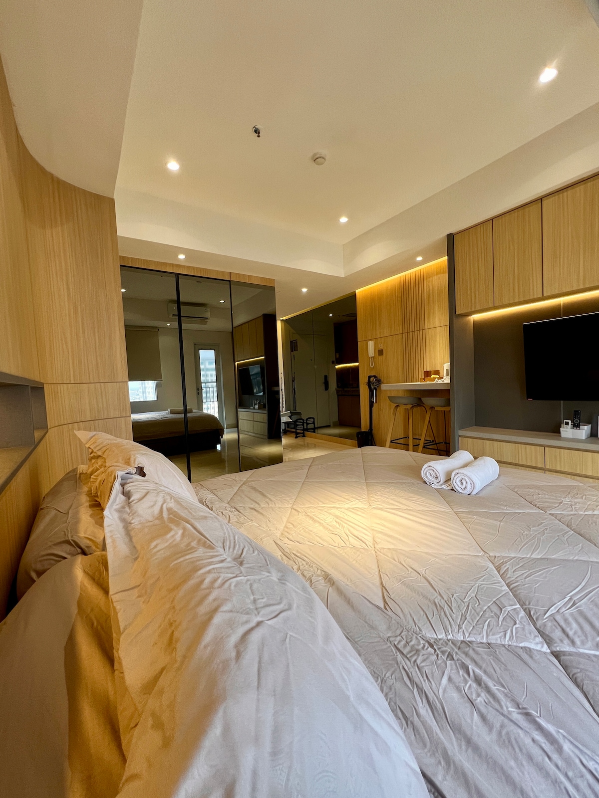 Apartment in Podomoro City Deli Medan Apartment Specifications: • Bedrooms: 2 • Bathroom: 1 • 1 king bed, 2 single bed, 1 sofa bed • Unit size: 56 m² • Located in the heart of Medan city Discounts available for stays longer than 1 night. The longer you stay, the greater the discount.