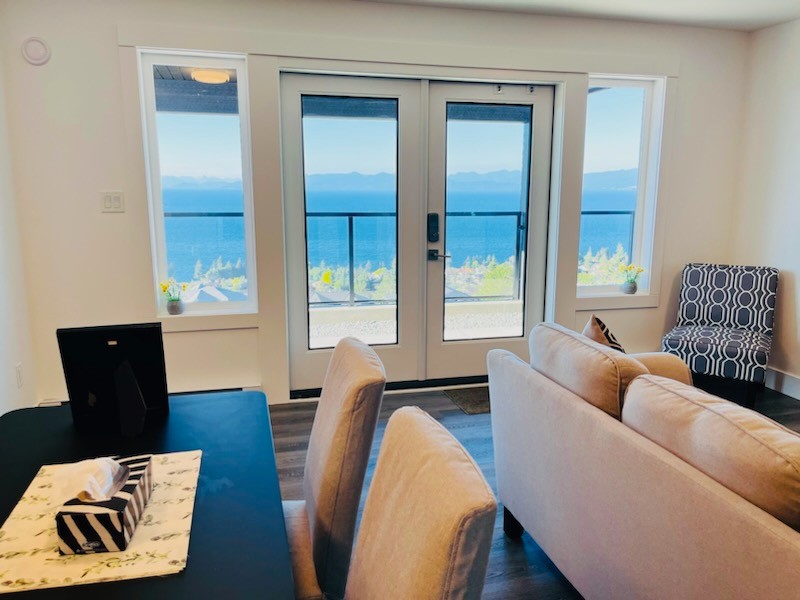 Nossa suíte é um impressionante retiro de um quarto recém-construído, com um teto de 9' e um espaço generoso de 810 SF. Possui uma Smart TV de 58 polegadas e uma cozinha totalmente equipada, garantindo um estilo de vida de alta qualidade durante suas viagens. Delicie-se com o nascer e o pôr do sol de tirar o fôlego da sua varanda privada, com uma vista magnífica para o oceano e as montanhas através do Estreito da Geórgia. Convenientemente localizada, nossa suíte é uma base ideal para descobrir o fascínio da Ilha de Vancouver.