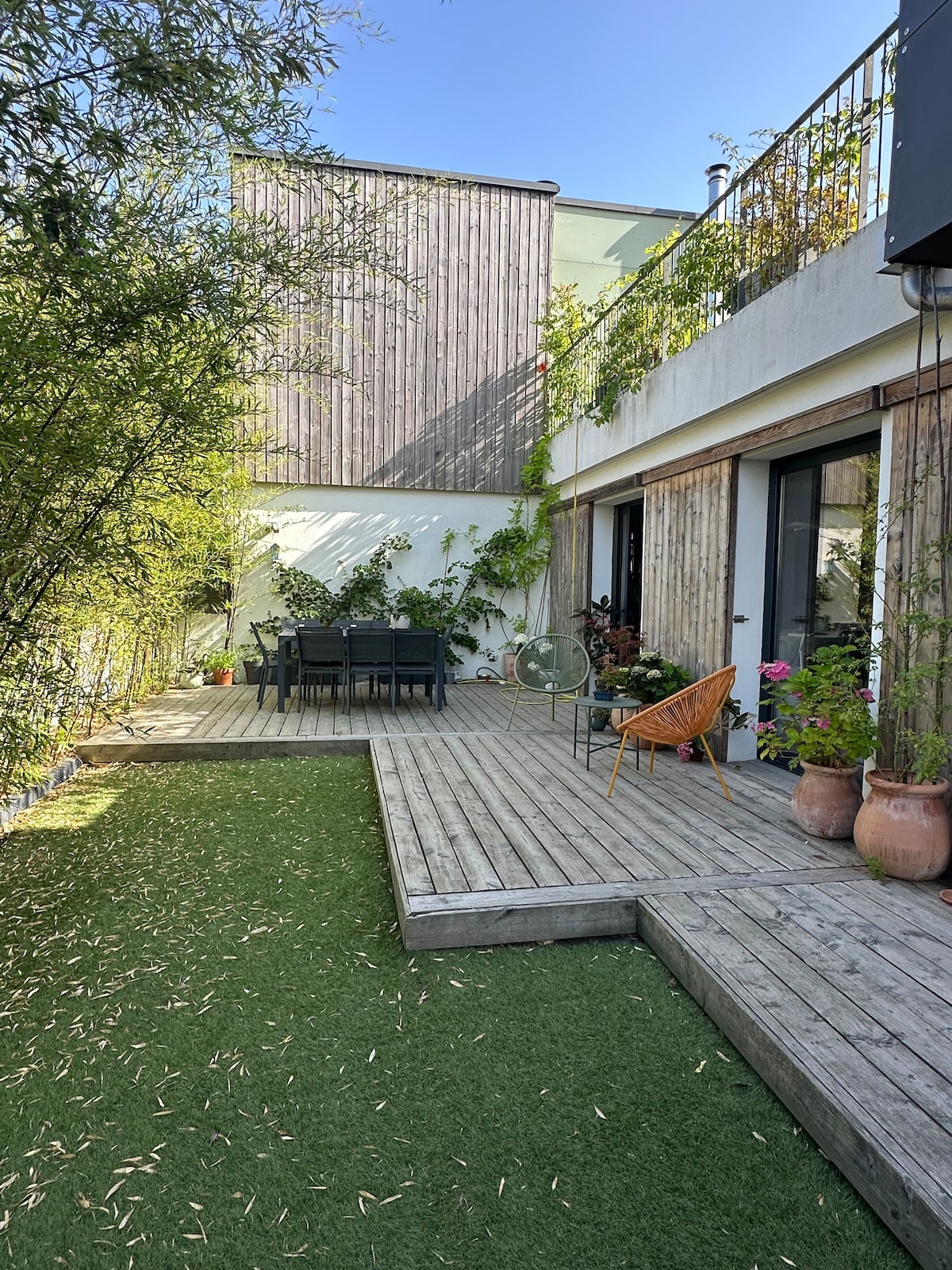 A deux pas de l' Erdre, vous goûterez au calme paisible de ce petit nid douillet situé en fond d'impasse. A deux pas de la station de Bicloos pour ceux qui aiment allier sport et déplacements, pour les autres, le tramway vous conduit directement au centre ville historique. L'Erdre et ses promenades à pied ou en petit bateau électrique (location possible aux beaux jours sur l'île de Versailles à deux pas) Vous apprécierez la terrasse en bois où vous pourrez prendre vos repas.