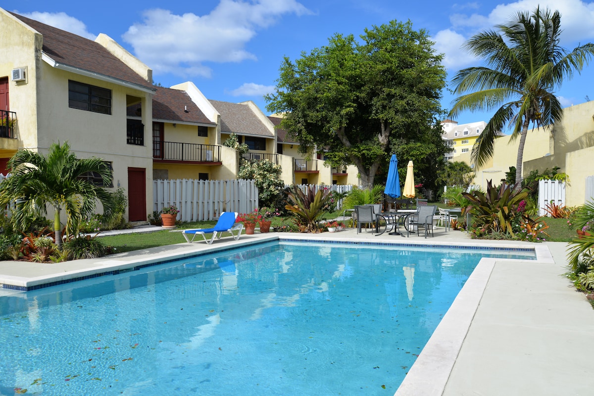 Unidade moderna de 1BR, 1BA em um complexo fechado com acesso à piscina em Westridge, a poucos passos do supermercado, a 2 minutos a pé do ônibus público e a poucos minutos de Cable Beach, Baha Mar e do aeroporto. Dispõe de Smart TV com streaming, Wi-Fi rápido, gerador de backup, estacionamento gratuito, cafeteira Keurig com cápsulas, toalhas de praia, cadeiras de praia, equipamento de mergulho com snorkel e pack-and-play mediante solicitação — perfeito para casais e viajantes individuais que visitam as Bahamas.