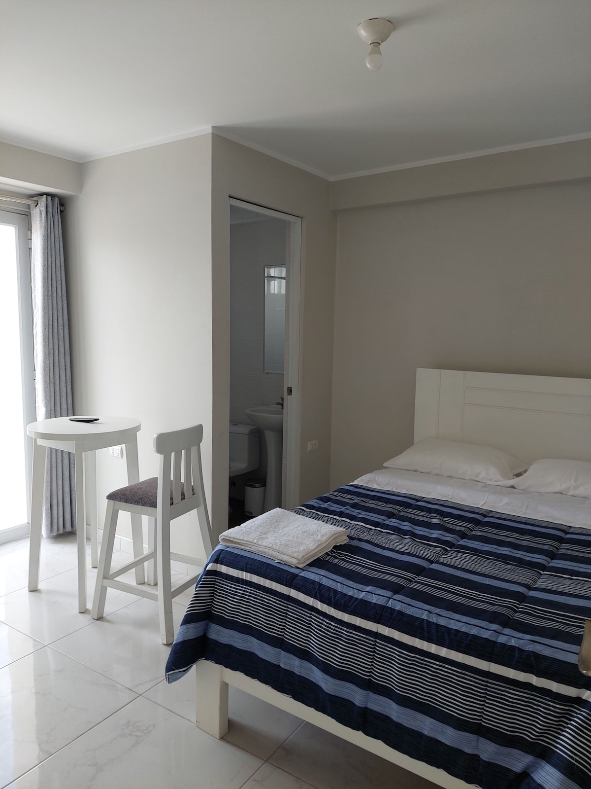 Quarto acolhedor com uma entrada independente em Nazca, perfeito para casais, pequenos grupos e famílias pequenas. Localizado no primeiro andar, este espaço moderno dispõe de uma cama de casal, uma cama de solteiro, um banheiro completo com água quente, uma pequena área de estar, frigobar, um ventilador de pé e Wi-Fi. Inclui TV a cabo, acesso a cozinha compartilhada e lavanderia; estacionamento espaçoso. Situado em uma área segura, a apenas 15 minutos a pé da praça principal. Uma escolha ideal para uma estadia confortável e relaxante na cidade.