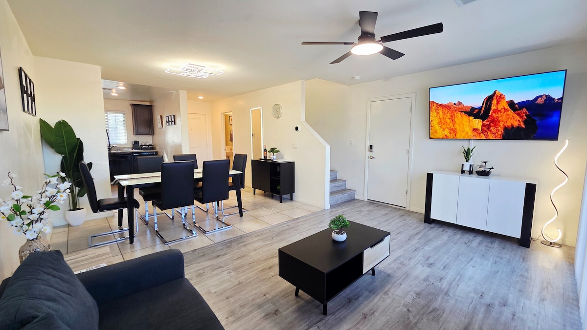 Férias modernas/trabalho de qualquer lugar na fabulosa Las Vegas, a apenas 6 milhas do centro da cidade! Relaxe com conforto em nossa casa arejada e elegante com retiro King e experiência de banho de spa no quarto principal. O relaxamento ao ar livre espera por você em nosso exuberante pátio oásis de paisagismo maduro com rede, jantar, área de conversação, lareira. Nossa casa iluminada fica perto de tudo o que você quer fazer em LV: natureza, compras, jogos de azar, vida noturna, refeições requintadas, temos tudo na capital mundial do entretenimento!