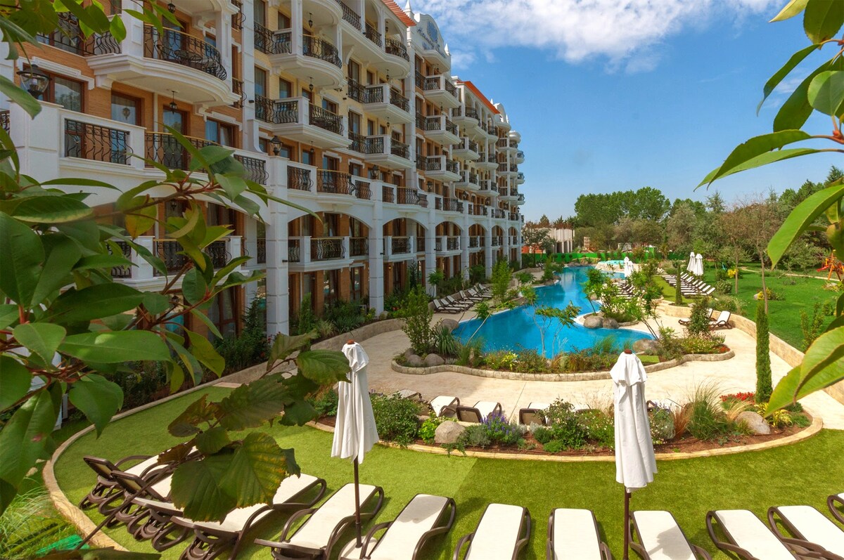 🌴 Relaxe à beira da piscina no nosso apartamento ensolarado do resort de praia Bem-vindo ao seu refúgio perfeito em Sunny Beach! Nosso moderno apartamento no térreo oferece acesso direto a uma piscina VIP, combinando conforto, conveniência e relaxamento em estilo resort, ideal para casais, famílias ou amigos. Localizado no cobiçado Harmony Suites 16 Grand Resort, você desfrutará de um ambiente tranquilo enquanto se mantém perto de tudo o que Sunny Beach tem a oferecer.
