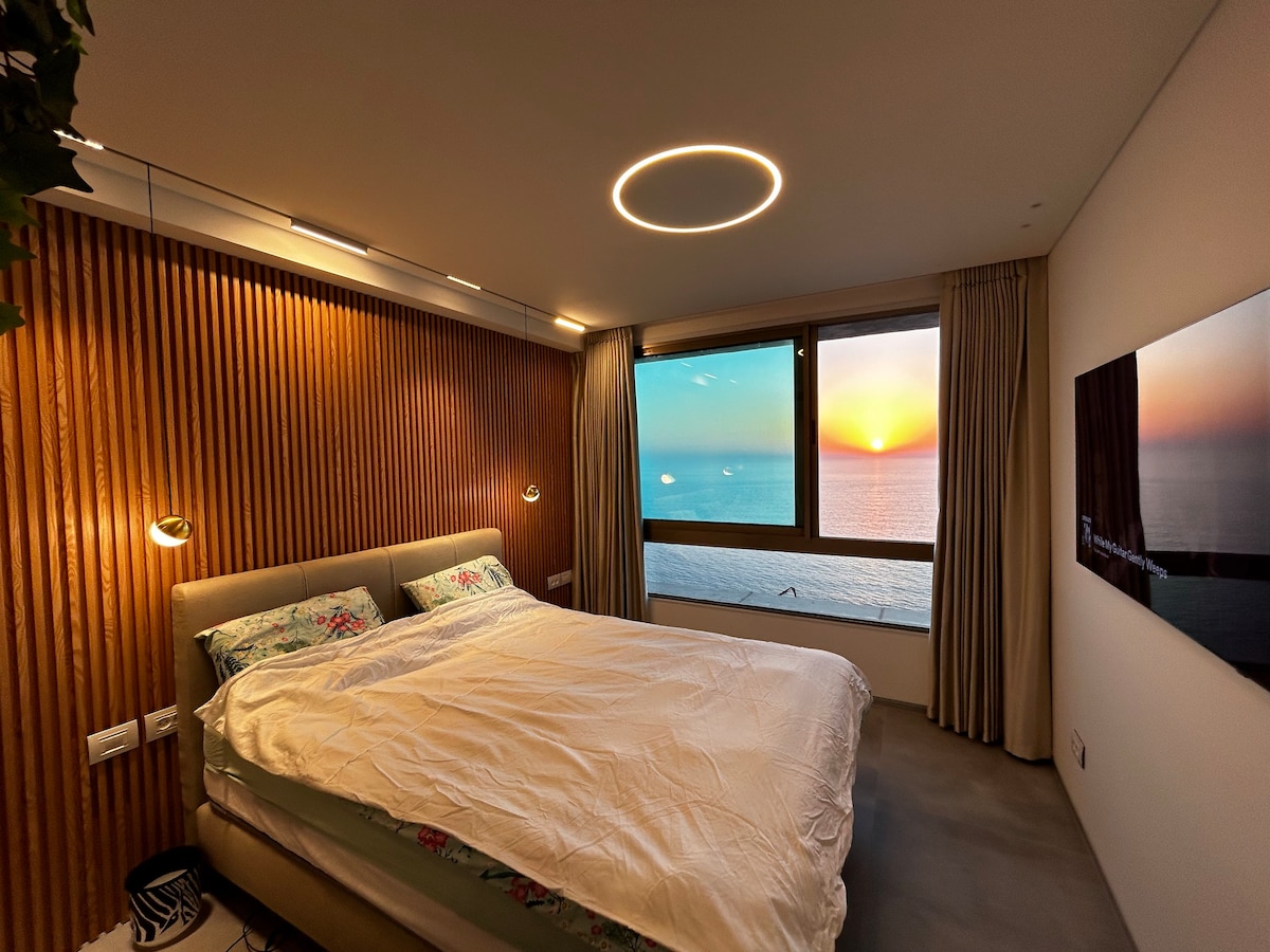 Bem-vindo a um estúdio renovado à beira-mar acima da praia, onde vistas deslumbrantes do mar, pôr do sol e o som das ondas esperam por você. Este estúdio oferece design moderno de alto nível, a 15 minutos a pé do Kikar e da entrada pública da praia, no edifício - supermercado, estacionamento gratuito, buffet/restaurantes, elevador de Shabat. Uma escolha aconchegante perfeita para casais. As fotos são genuínas.