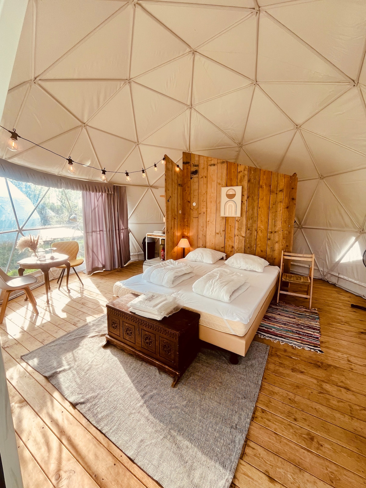De Droomdome op Landgoed Energy-Up is een unieke accommodatie die een perfecte mix biedt van luxe en natuurlijke omgeving. Gelegen te midden van het prachtige landschap, biedt deze eigentijdse koepelvormige structuur een onvergetelijke ervaring voor gasten die op zoek zijn naar rust, avontuur en comfort. In de droomstome staan 4 comfortabele 1-persoonsbedden, waarvan er twee aan elkaar zijn geschoven tot een 2-persoonsbed.