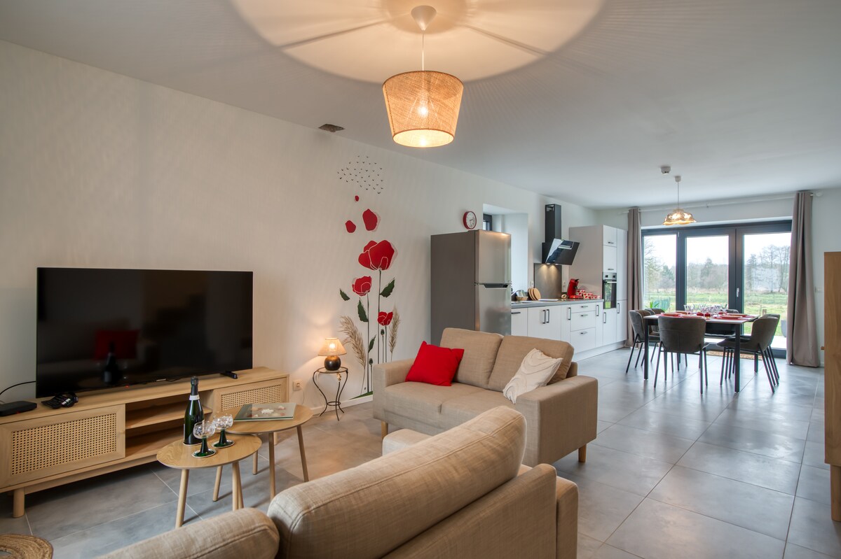 Casa de férias muito confortável para 6 a 8 pessoas localizada nas alturas da aldeia de Warmifontaine (Neufchâteau). Projetada com cuidado, é a garantia de uma experiência inesquecível no coração das Ardenas. Super funcional, nada falta! 4 quartos (possibilidade de um 5º), um banheiro muito bonito, uma cozinha totalmente equipada, uma sala de jantar, uma área de estar confortável com um fogão a lenha, uma garagem, estacionamento ao ar livre. Terraço, jardim privado e vista deslumbrante!